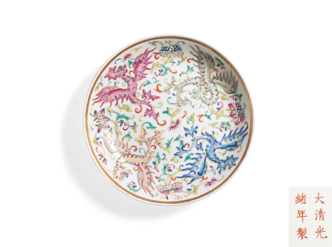 说明:盘敞口,弧壁,圈足,盘心以粉彩绘制红、蓝两只夔凤穿梭花间,有条不紊,外壁粉彩分绘牡丹、宝相、荷花三组变形折枝花卉,釉色洁白,胎质细密,底落青花“大清光绪年制”楷书款。此盘色彩明丽,绘画精美,夔凤栩栩如生,为光绪朝官窑夔凤纹典型器。凤纹含有天下太平、万物安宁之意,其纹饰盛行于各朝官窑,乾隆以后,瓷器上描绘凤纹又有龙凤合一的趋势,即为夔凤纹,风格由粗犷转为细腻,夔凤纹一直延续至清代晚期,成为十九世纪官窑中的传统纹饰。