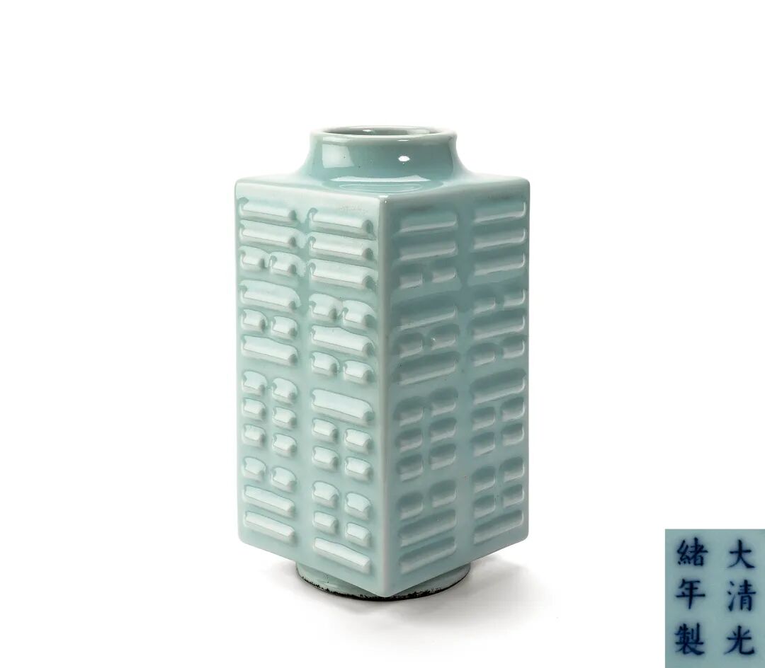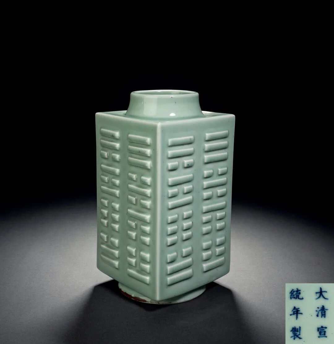 说明:器身四面均饰八卦图案,其造型仿先秦礼器“玉琮”,始见于宋代,官、民窑均有烧制,清代乾隆朝以后成为官窑的传统器形,底圆体方,暗喻天圆地方之意。本品通体施粉青釉,釉层肥润,釉色滋润明亮,形制端庄典雅,底书“大清光绪年制”,为光绪官窑同类器的佳作。