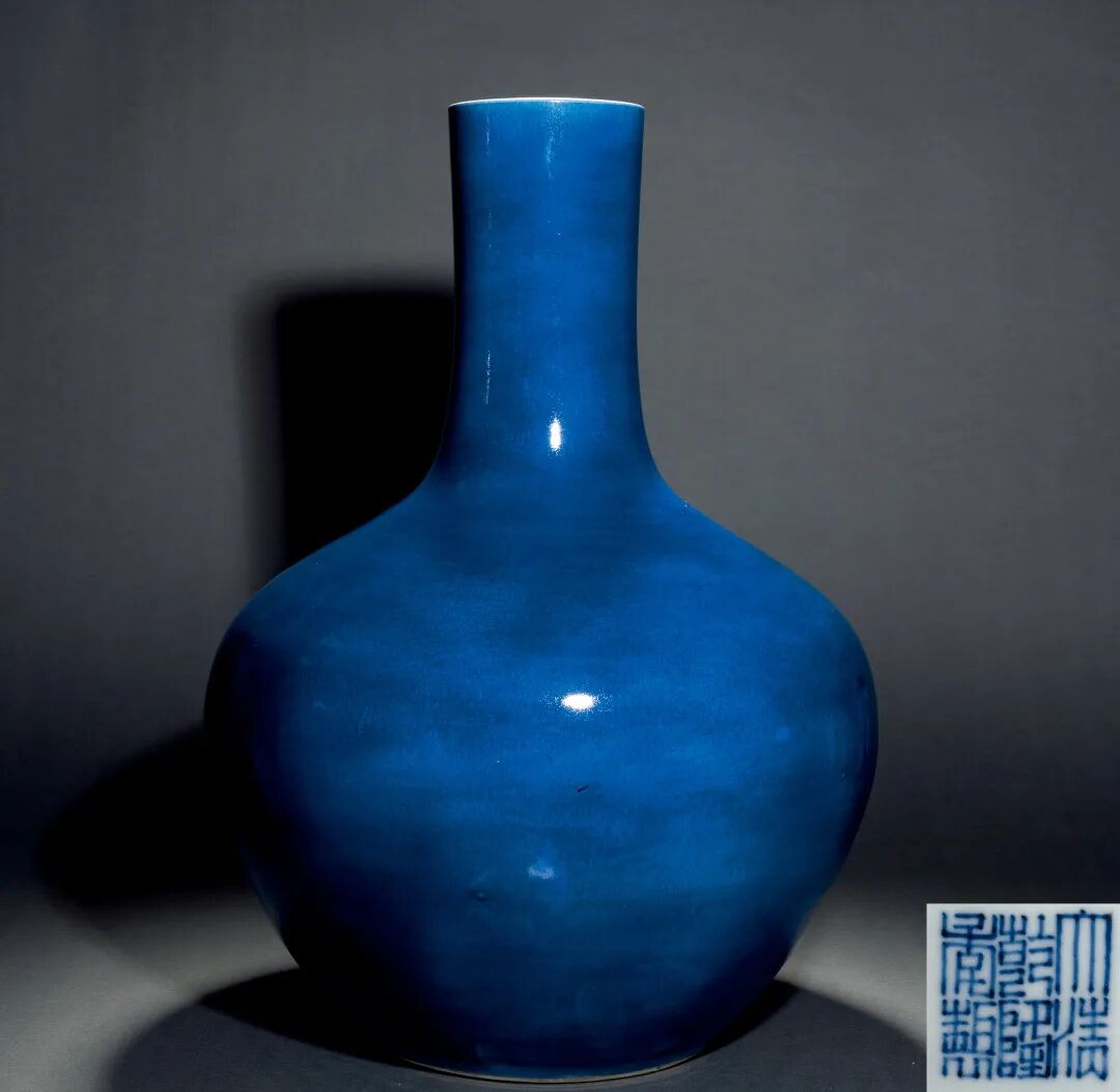 说明:天球瓶是受西亚铜瓶造型启发而烧造的瓷器,瓶形为直口、长颈、丰肩、圈足。因圆球腹硕大,像是从天降下来似的,故名。其创烧于明代永乐年间的御窑厂。清朝皇室对永宣窑器的推崇致使摹古之风盛行,御窑厂承命竭力摹制,本品即为一例,拍品天球瓶造型古雅端庄,线条优美圆润,器内与底部均施白釉。通体施饰霁蓝釉,匀净明亮,苍妍夺目,一如宣窑之宝石蓝,其出色之妍丽独步有清一代,为光绪同类御瓷之冠。其高度达55厘米,恢宏大气,非常罕见。目前所知的其它蓝釉天球瓶大多低于此高度,此为天球瓶最大之尺寸者之一,能与之相比肩者甚少。其底足旋修极为工整,胎骨细白莹润,底为「大清乾隆年制」青花款。蓝釉烧制工艺继承元代传统,至清代生产历朝未断,且烧制精细,常见造型是宫廷祭器和陈设用瓷。《南窑笔记》中把它和霁红、甜白相提并论,推为宣德瓷器的上品。天球瓶始于明代永乐、宣德年间,原名为「千秋瓶」,象征着「千秋太平」之意。本品亦达到「师古而不泥古,仿古而不忘新意」的境地,其线条优美圆润,通体施宝石蓝釉,匀净明亮,苍妍夺目。器型硕大,气势恢宏,极为罕见。同时来源清晰可靠,为难得的收藏之佳品。