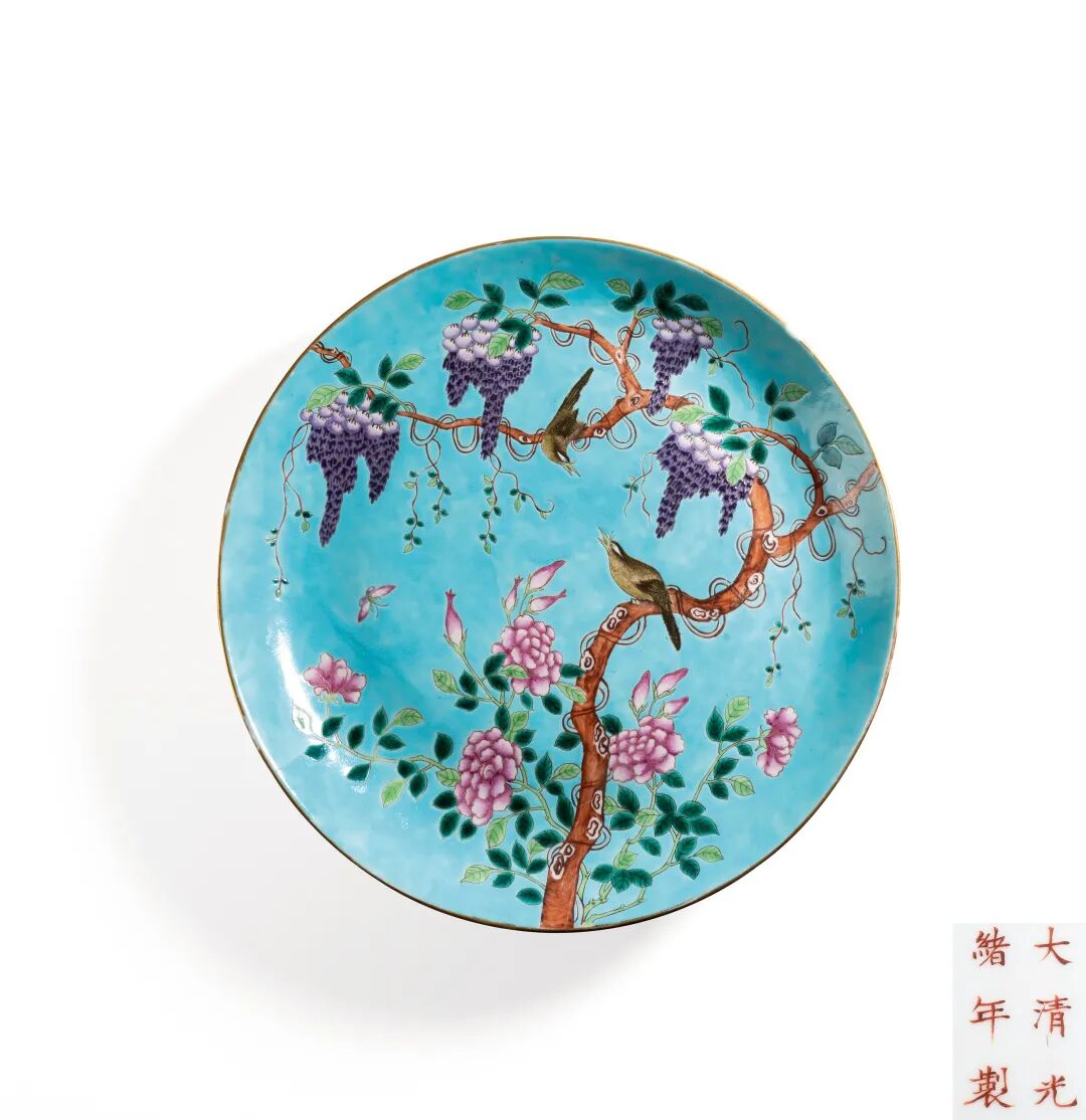 说明:拍品敞口,浅弧腹,圈足。此类盘为清代官窑传统品种。以红蝠和青花双弦纹装饰,主题及寓意皆鲜明。盘心五只红蝠围成团状,寓“五福”之意,盘外壁亦绘蝙蝠,作散点式排列,此纹饰并有“洪福齐天”之意。底落「大清光绪年制」六字二行楷书款。