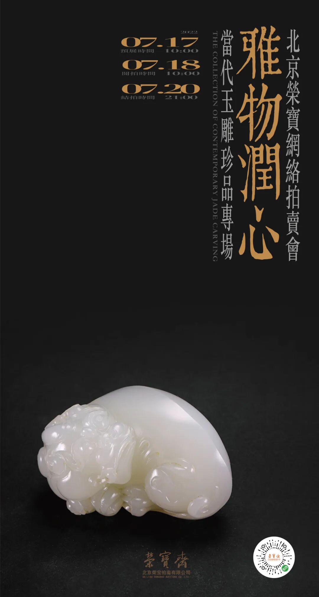 北京荣宝——雅物润心·当代玉雕珍品专场网络拍卖会将于7月17日10:00—7月18日10:00开启线上预展,并于7月18日10:00开拍,7月20日21:00结拍。