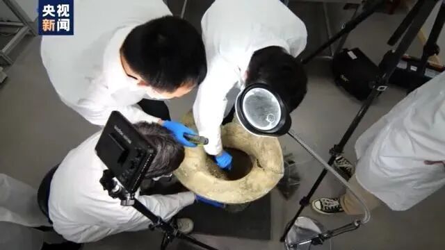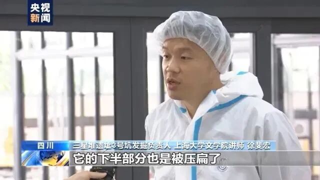三星堆遗址3号祭祀坑发掘负责人 徐斐宏:圆口方尊也是我们坑里的一个明星文物,之前属于我们坑的一个北部偏东的位置。但是提出来之后我们发现,它的下半部分被压扁了,变形还是很厉害的,它器腹里面的海贝很多都露了出来,所以你会看到圆口方尊下面有很多白色的海贝。
