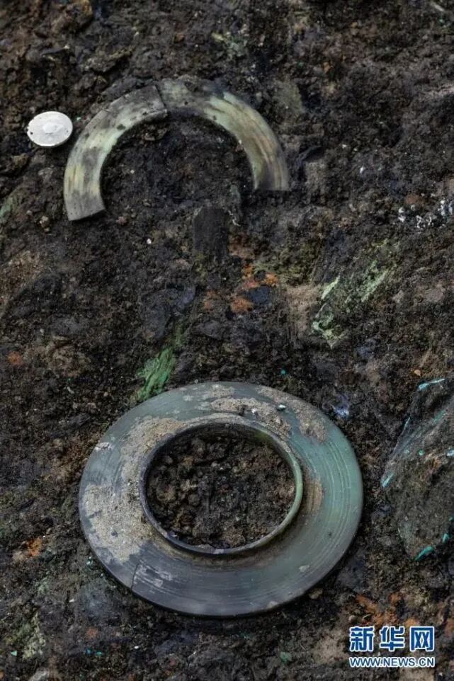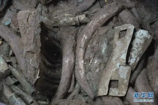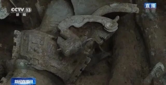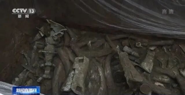 △三星堆考古发掘现场3号“祭祀坑”中新发现的青铜器和象牙(5月26日摄)