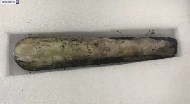 5月29日,三星堆又出土一件珍贵文物。一件凹刃玉凿在4号坑的中部被发现,上面所叠压的象牙被提取之后,已经完全暴露出来。