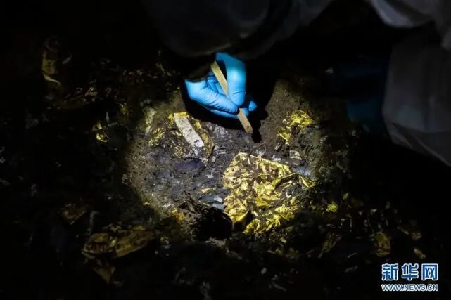 △在三星堆考古发掘现场5号“祭祀坑”中,考古人员清理新发现的金面具残片