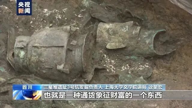 三星堆遗址3号祭祀坑发掘负责人 徐斐宏:大口尊这种器物在中原地区它是酒器,但是到三星堆这边,虽然它用了受中原文化影响的青铜容器,但是它不是照单全收的。我们目前没有发现在三星堆的这些容器里面是存酒的这个证据,反而里面有很多是藏有大量的海贝,包括我们前期清理的一部分,大口尊和圆口方尊里面都有海贝。