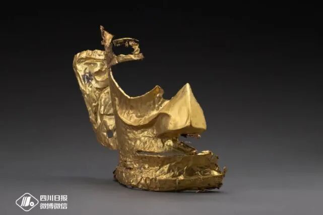 报道显示,新出土的金面具残片和其他面具形态相似,耳朵宽大,眼睛突出,鼻子也比较高,嘴巴微微上扬,是一种神秘微笑的造型。