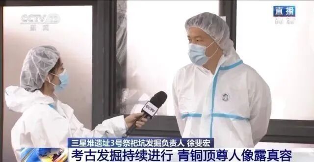 三星堆遗址3号祭祀坑发掘负责人 徐斐宏:青铜顶尊人像的正面基本揭露出来,因为其附近还有些象牙和中小型青铜器,为了保证青铜顶尊人像的提取万无一失,我们要把附近的遗物先行提取一部分来扩大工作空间,所以大家想看到青铜顶尊人像的全貌还得过一段时间。
