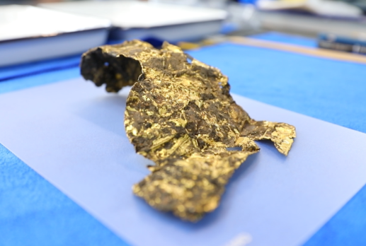 “这是我们刚刚提取的一个金面具残片,能够很清晰地看到它的眼睛和嘴巴,它应该是一个相对来说比较完整的金面具,这也是我们8号坑目前发现的最大的一个金面具残片,”8号坑坑长、北京大学考古文博学院博士后蔡宁介绍。