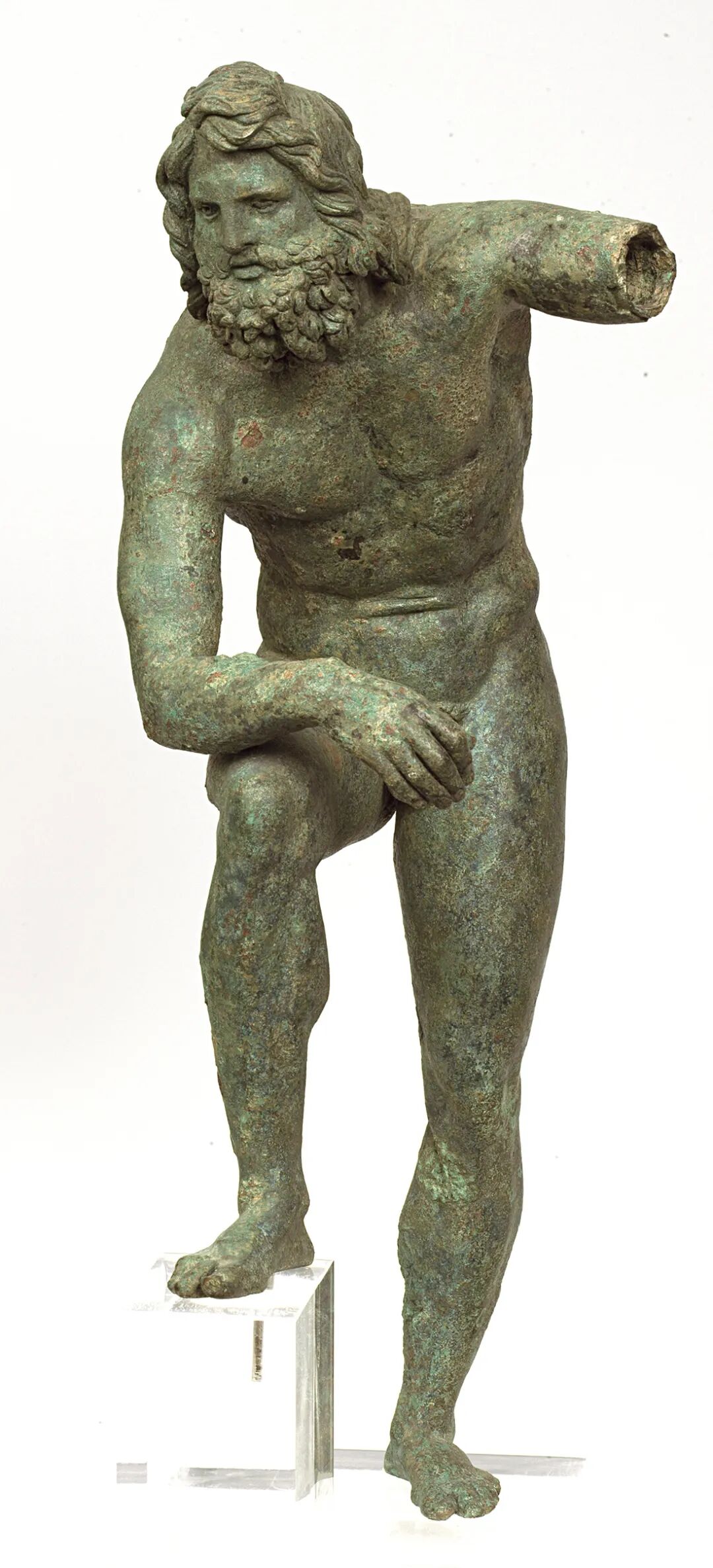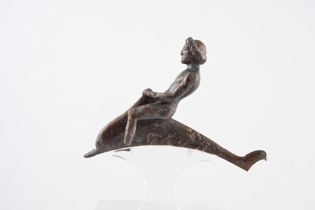 该像1888年发现于帕特农神庙东南部,是一件被献给雅典卫城圣殿的青铜容器上的装饰物。一位赤身裸体的青年正骑在一只海豚上,左手抓住它的背鳍。年轻男子与这只鲸目动物间的反向动作表现出他们在海上航行时的自然主义和激烈感。这一主题在古希腊艺术中尤为流行,因为它与海豚从海上冒险中拯救人类的神话有关。