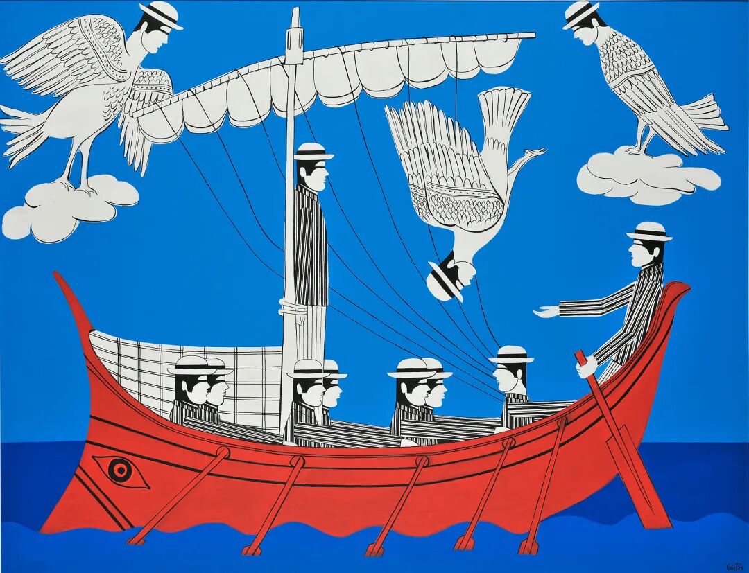 在这件作品中,扬尼斯·盖蒂斯以简单巧妙的方式结合了历史、古代和神话,并赋予个人特色。整体构图受到大英博物馆藏古代陶瓶的影响,人物构图、排列方式、姿态与古代瓶绘如一辙。唯一不同的是艺术家用戴着帽子的男性头颅取代了塞壬女性们的头颅。他以个人化且具启发性的方式,致敬了从古代至二十世纪的传统与知识,巧妙地贯穿了海洋文化的今昔。