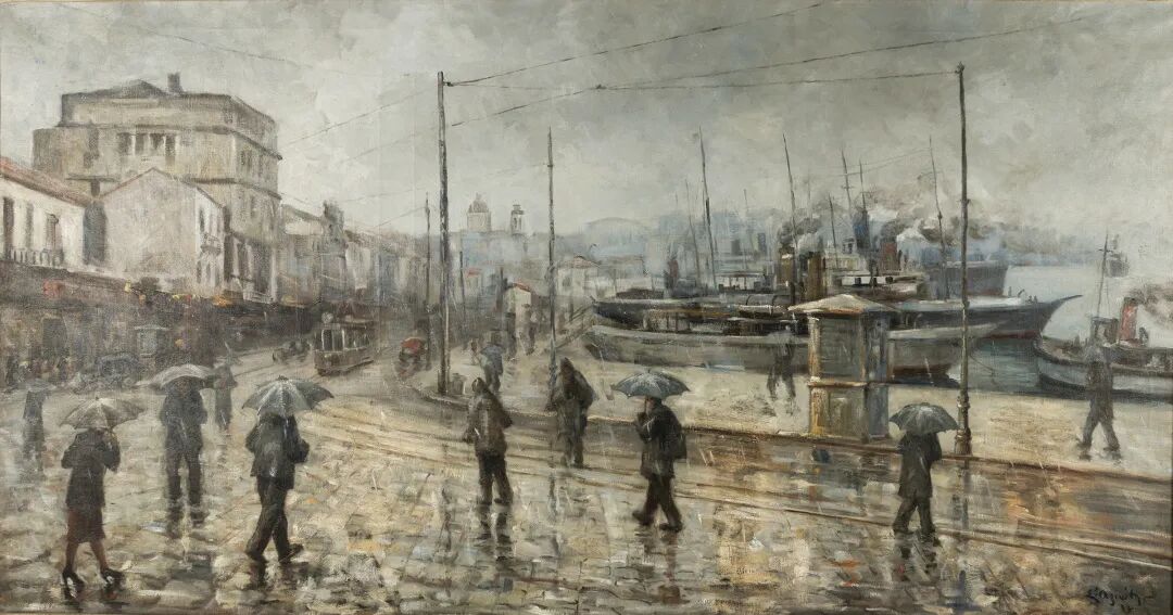 斯特拉提斯·阿西奥蒂斯的作品以暗色调为主,游走于现实主义和印象主义之间。受当时社会影响,他常以港口、船厂和船舶作为绘画题材。本作品描绘了比雷埃夫斯港口一个标志性的区域——雨中长堤 ,它通往圣尼古拉斯教堂和海关办公室。