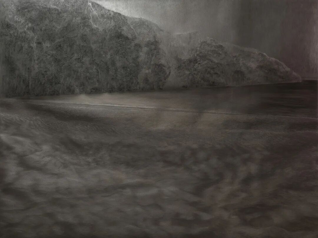 作品再现了尼科斯·托帕利迪斯记忆中潮起潮落的海岸景观。艺术家以石墨和蜡的密集叠加、刮除和再次叠加为表现技法,塑造出多个涂层的画面,并留下创作过程的痕迹。尽管作品总体色调昏暗,但通过光的反射而营造的各种忽明忽暗细节,使观者从局部分析中感知整体,成为艺术家描绘景致中的“漫游者”。