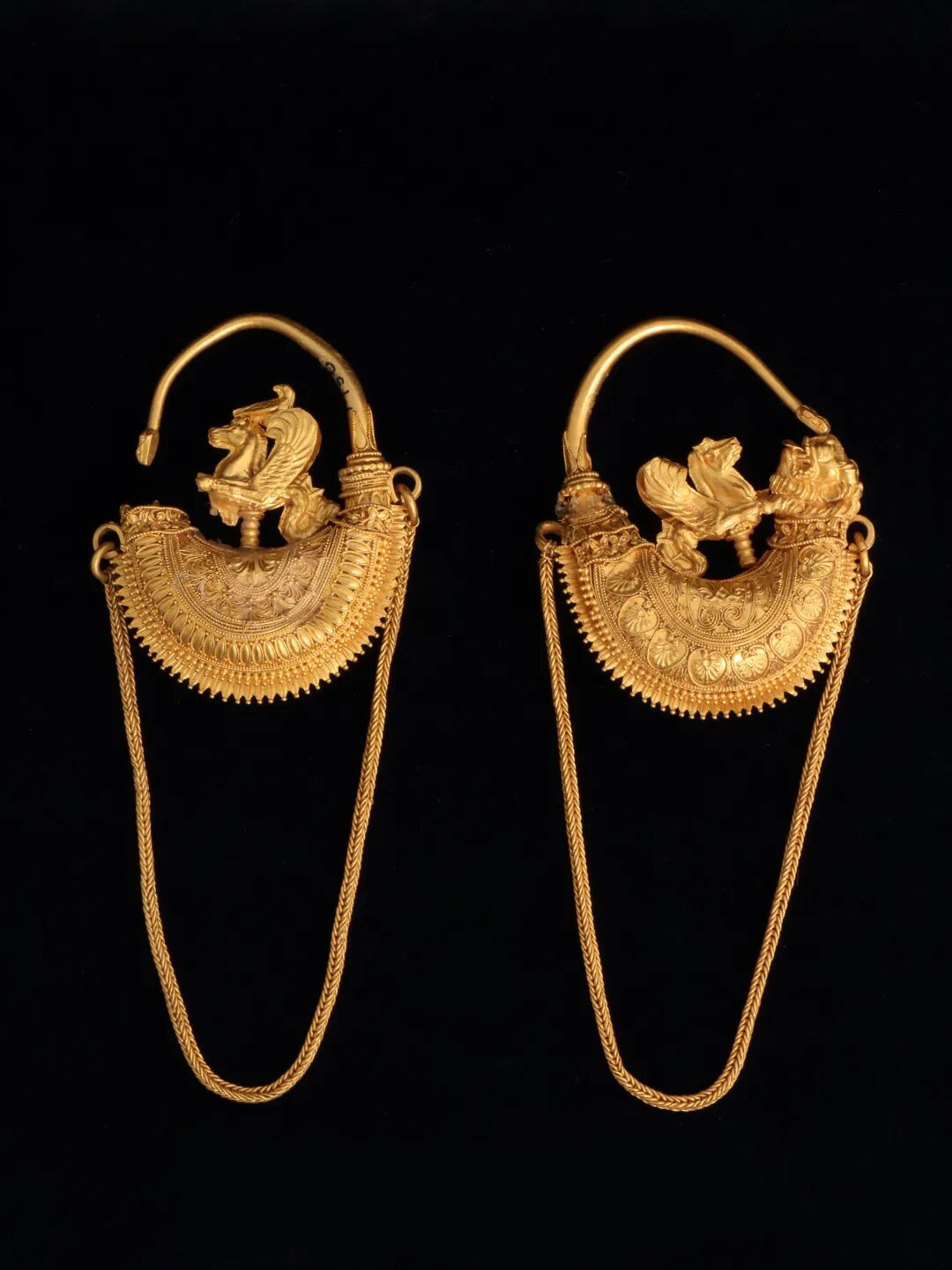 耳环呈船型,尾端饰有金丝细工的狮首,船身上栖息有翼海马和小鸟。耳环以前后两半构成,上下端接合处均覆盖一排排细密的金珠颗粒。海马由前后两片金箔制成,经过切割并以浅浮雕装饰,狮首则是单独制作的。长金链松散地垂下,两端由靠近船顶部的圆环固定。
