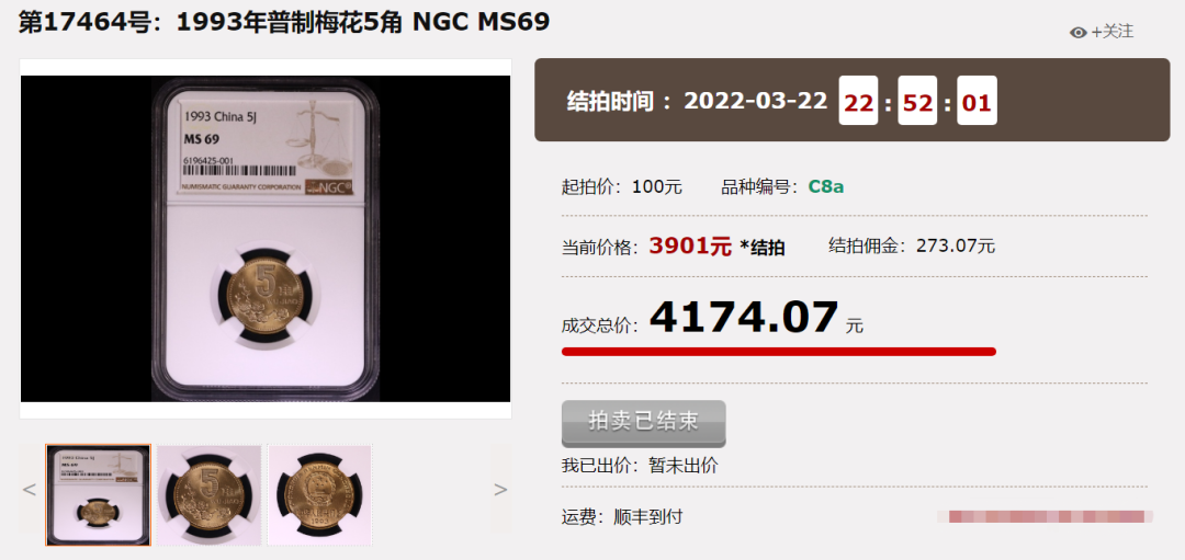 梅花5角一共发行了11年,其中1993年的梅花5角价格最高。比如年初就有一枚NGC69分的93年梅花5角,以4000多元成交。