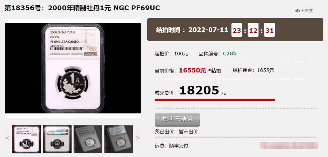 在前两天结束的一场拍卖中,一枚NGC 69冠军分的2000年精制牡丹1元,以1.8万元结拍,太猛了!