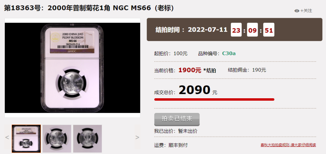 就在两天前的一场拍卖中,一枚2000年 NGC66分的菊花1角,就拍出了2090元的高价!
