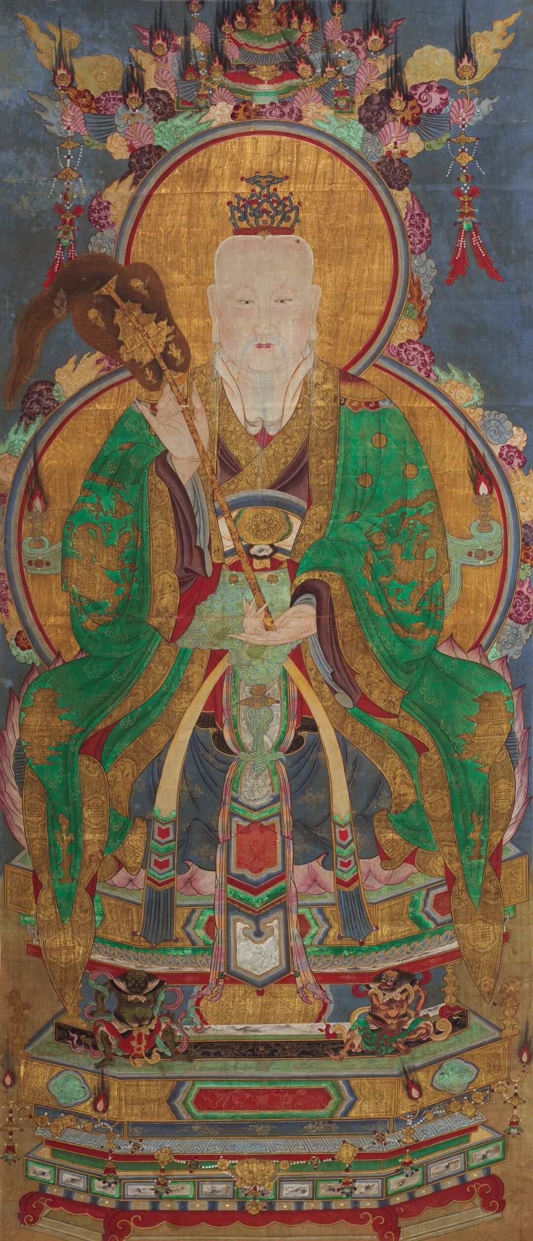 Lot.671 作品为道教三尊中的道德天尊,为道教三清之一,天尊手执扇,扇上有宫阙;着绿袍,皓首白须,有头光和背光。在道教和一些地方宗教中,三清均为供奉的主尊,因此比较难以分清这是哪一种道教法事所用神祇,一般在道教黄箓斋和地方信仰中会出现三清。