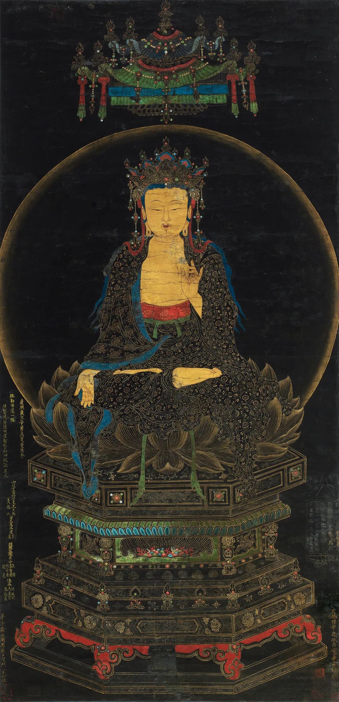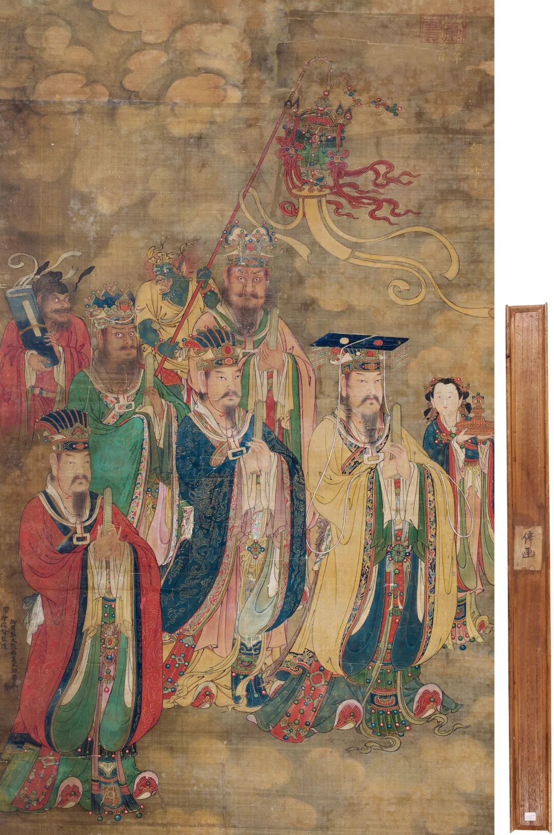 本件宫廷佛画,原裱原配木盒,题识“御用监太监尚义王勤等奉命提督监造”,用金字写有“景泰五年月初三日”,钤“广运之宝”方印。尚义和王勤,都是明朝主管佛事的内廷太监,尤以尚义的地位为高。早在明宣德二年之前,尚义就是御用监太监,地位甚至要高于同时期的郑和,他至少身历五朝,主要负责皇家的佛教事务。当时,大兴隆寺和大隆福寺号称巨刹,是朝廷的香火院,尤以大隆福寺为明景帝所推重。据《明实录·景帝》卷 62 所记载,就在大隆福寺建成的第二年(景泰五年),八月初三日,明景帝朱祁钰生辰之际,举行了盛大的庆典,“八月壬午,万寿圣节,出御奉天殿受朝贺,大宴文武群臣及四夷朝使”。本件宫廷佛画与现存法国巴黎集美博物馆“景泰五年八月初三日”款三十余幅佛画,均是明景帝朱祁钰在位时精心敕造的一套明代宫廷佛画。