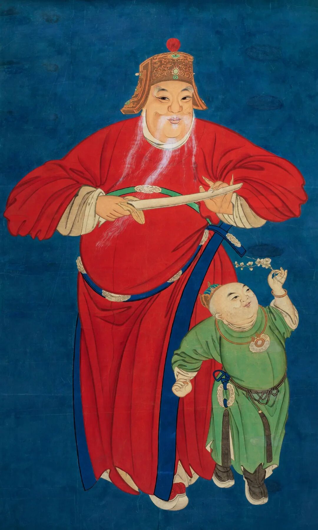Lot.674 作品为禄星,禄星为老年男子形象,着红袍官服,手执笏板。禄星和身旁的小孩形成了有趣的互动。禄星是中国传统的福禄寿三星之一,专门掌管考试进爵等事宜,是老百姓日常离不开的,需要经常供奉和祈求的神祇。Lot.673 号作品也是禄星,清代风格。本图应是据古代粉本画成,构图比较复杂,人物较多,但很疏朗不拥挤。禄星一身官服坐正中圈椅上,旁边有童子等执华盖、如意、瓶、跪着鹿的莲花座,华盖上画着龙前面是几个活泼好动的孩童在玩耍,手上执石榴。这些都代表了一定的喻意。两幅均为民间道场所用神像。