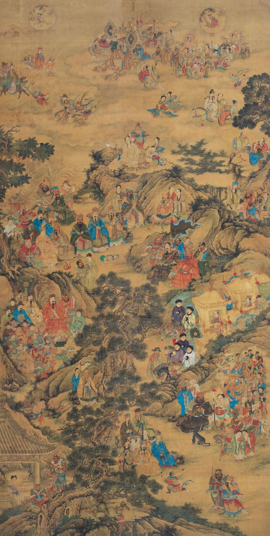Lot.672 作品为众仙图。看山石、人物和动物的画法似为清代画风,而且画上出现了明暗画法,应该是清代中期以后的作品。此幅的构图似乎分为天地人三界。天上有太阳和月亮,分别用一红衣三目神托着三足乌代表月亮,用嫦娥带一侍女嫦娥手上捧着玉兔代表月亮。玉帝王母各乘龙凤车舆带着随从出行,二十八宿等用动物代表作为标识,以上均画在上层。中层大致真武为主尊的雷部元帅、以观音为主尊的善财龙女和韦陀等围绕的众神、以关羽为主尊的关平周仓等侍从环绕的众神,还有神农、福禄寿三台星君等。下层可见刘海戏蟾、和合二仙等。本幅为清代风格,应为清代作品。这样类似的神像流传下来比较多,有人认为是挂在中堂的,不过笔者依然倾向于认为这是地方民间道场画,应该是某种法事上使用的神像画。