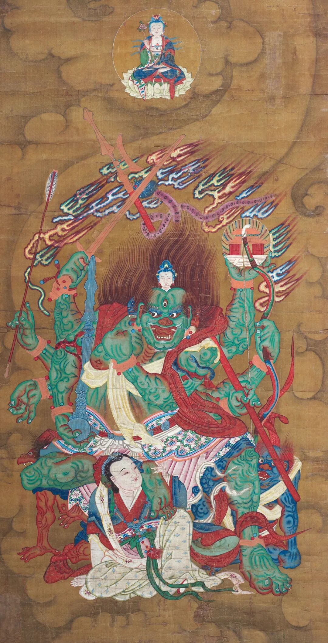 Lot.668 是释道画中的大力明王,由大势至菩萨化现,看时代风格,本幅应为明代晚期作品,和万历37 年李太后造的释道画粉本和风格完全相同。《北京文物大粹》佛造像卷(下)56 页就是大力明王,和本幅只有颜色等少许差异,榜题为“大势至菩萨明王”。查阅《天地冥阳仪文校点》,大势至菩萨变现的明王并不在其中之列,可见明代中期以后很多释道画是新创造的粉本,并不依照古本来绘制,这就是一例。这件藏品和皇家造的释道画艺术价值及粉本一致,十分珍贵。