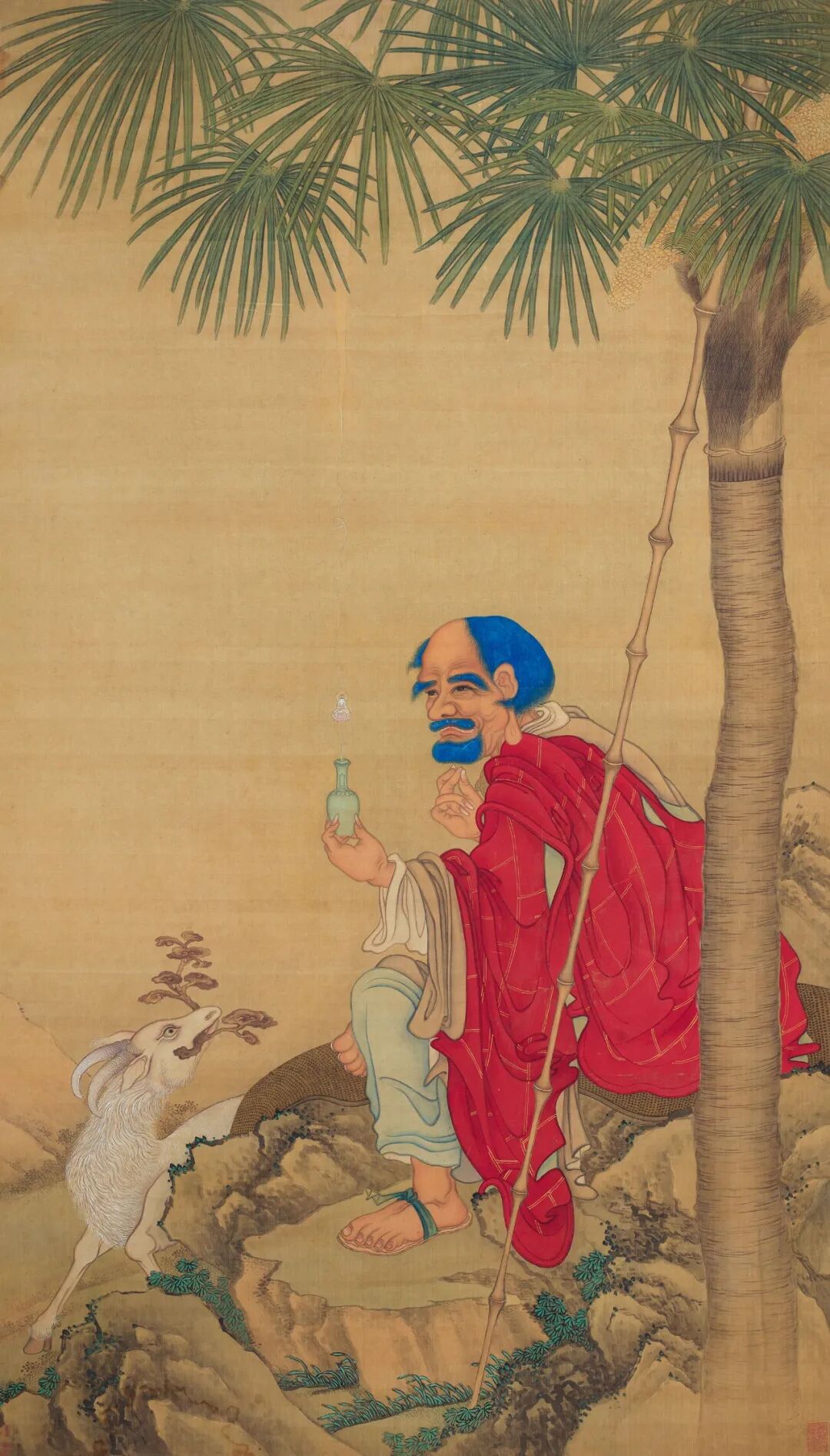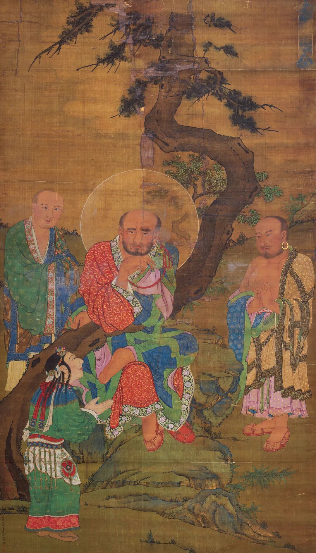 此幅画作表现的是迦诺迦伐蹉尊者(梵文:Kanakavatsa),其为十六尊者(sthavira/arhat)中的第七位,传说是佛祖最早的一批信徒。他头带光圈,坐一青绿山石之上,身前绕过蜿蜒苍劲的古松,尊者俯身撑扶于树干上,姿态自然随性。手中拿着一串念珠,身穿织锦袈裟,身两侧各侍立一名僧侣;画左下方有一位信徒来朝。画面以幽静的松石为背景,人物主次关系明确,形象生动,衣饰、山岩层次等局部描绘细致,为明代释道画中的精工之作。迦诺迦伐蹉出生于印度东北的比哈尔, 他的名字的意思是‘金象仔’,因为据传有头会屙金的小象跟他同时出生。此象对他十分忠心,形影不离,在他剃度之后依然紧随身边。金象的存在使得其它信徒无法摈除杂念专心修行,于是释迦牟尼命令迦诺迦伐蹉放了牠。迦诺迦伐蹉说他曾几次命牠离开都无效,不管怎么做金象还是会回到他身边来。佛祖说,如果你这么告诉牠,‘我已经脱离轮回,也不需要你陪伴’,说三次牠就会离开了。迦诺迦伐蹉照着做,金象果然遁入土中消失了。另一个与迦诺迦伐蹉有关的故事则是他曾到龙国化缘说法,使许多人皈依佛祖,龙国国王为了感谢他,给了他一个用奇珍异宝串成的念珠,便是画上他手中所拿的。