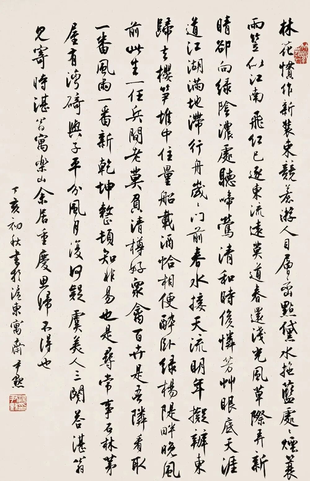 沈尹默诸体皆工,尤其擅长行书。初学褚遂良,后遍习晋唐诸名家。晚年融会了苏轼、米芾等人的风格,用笔清圆秀润中有劲健遒逸之姿。民国初年,书坛就有“南沈北于(右任)”之称。出版主要书法集、字帖有《沈尹默法书集》、《沈尹默手书词稿四种》、《沈尹默入蜀词墨迹》等,约二十种。诗词著作有《秋明室杂诗》、《秋明室长短句》等。