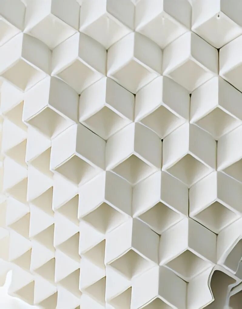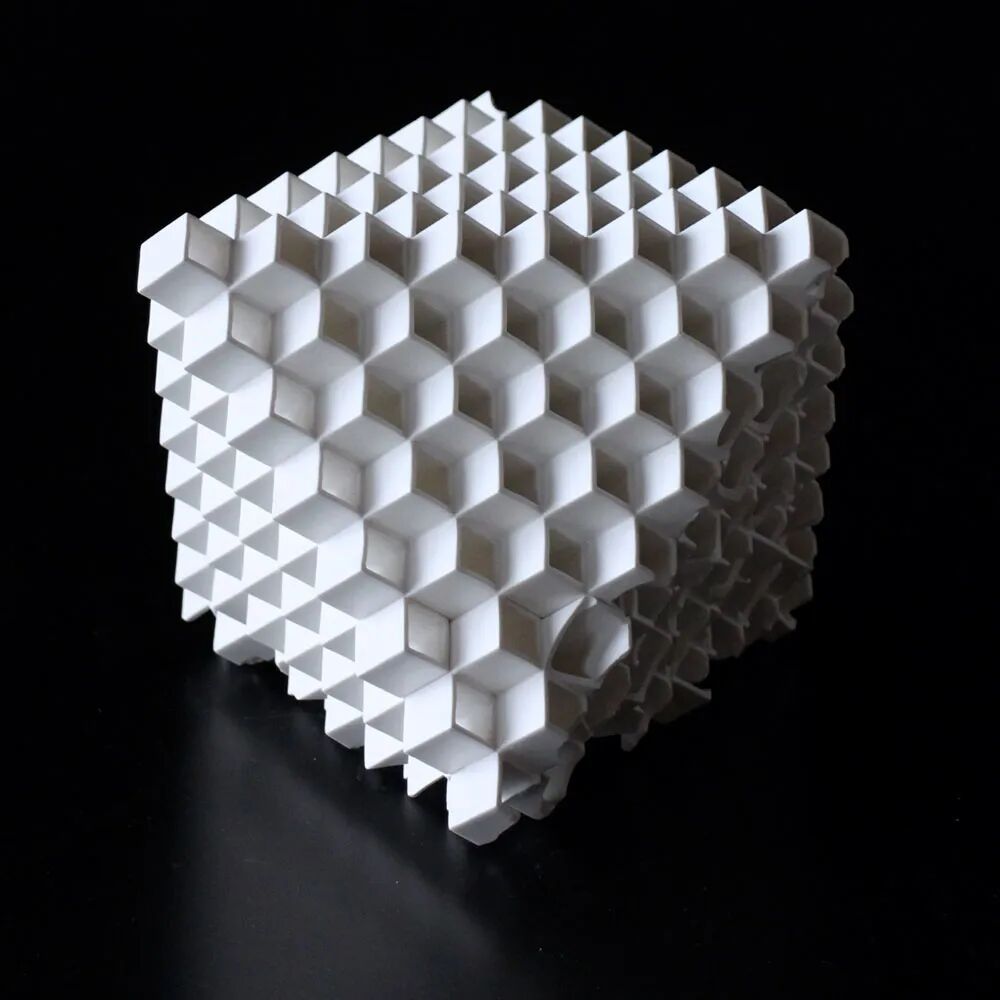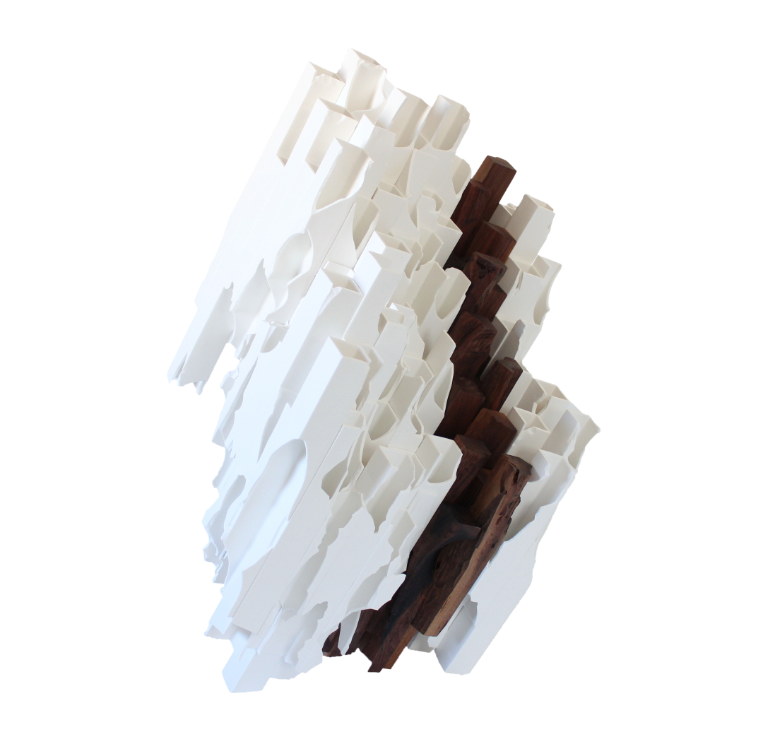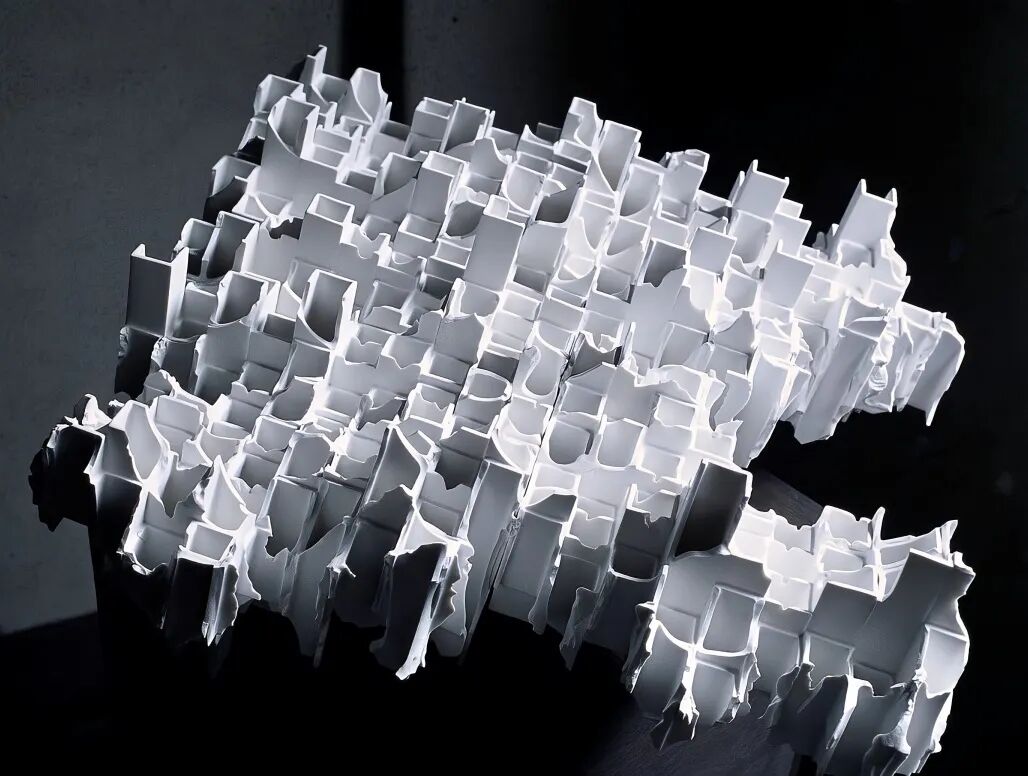 《现代遗迹》展现纯白如幻的“现代楼宇”残破与独自站立的万千模样,作品正是从偶然的破碎中开始,到有意识的敲击后获得了新生的意义,那是关于“现代” 的一次审视与反思:千百年后,我们生活的现代城市会是什么样子呢……