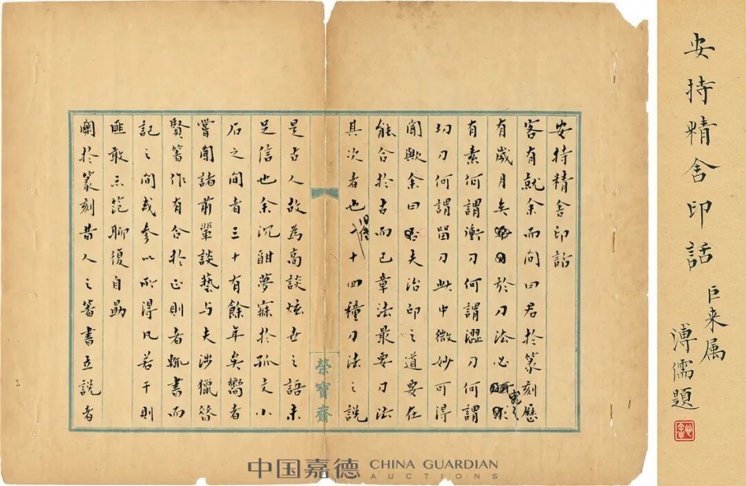 专场的重头大约可分三部分:第一部分,是陈巨来经典的自用印和自作印谱;第二部分是书画,除了陈巨来自己的作品,多数为张大千、吴湖帆、溥心畬、袁克文、江寒汀等名家为陈巨来所作书画及题跋;第三部分,是陈巨来的手稿和收藏,以及友朋之间的影像和信件往来。熟读陈巨来《安持精舍印聚》《陈巨来治印墨稿》和《安持人物琐忆》的人会对这些作品感到相当亲切,因为它们几乎都在书中刊登过,很长一段时间里,书上的印拓和图片是外人了解陈巨来的重要资料,而这将是原作第一次比较完整地出现在世人面前。如果换个角度来看,大可以将此专场视为《安持精舍印聚》和《安持人物琐忆》两本书的3D场景再现,其还原度有可能会刷新人们对于陈巨来的认知。