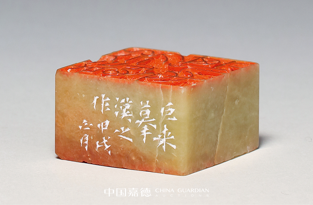 边款:巨来摹汉之作,甲戌正月。此余二十三岁所刻,巨来记,丁未六月,年六十三矣。