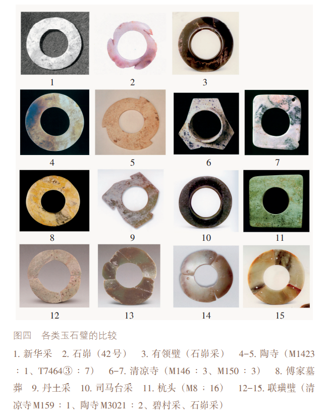 三地的璧环类玉器,均有普通型璧环、联璜璧、方形璧、有领璧和牙璧。(图四) 特别是结构复杂、制作费力的联璜璧和形制特殊、附加齿牙的牙璧,将三地玉器文化紧密地联系在了一起。这两类特殊的璧类玉石器,在以发达的玉器而享誉中国新石器时代的红山、凌家滩和良渚文化之中,均了无所见。