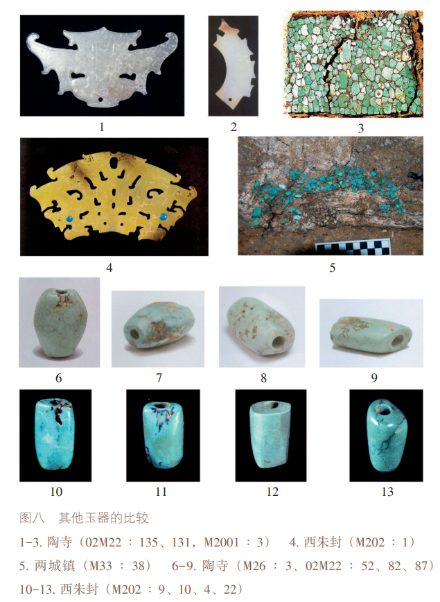 陶寺遗址还发现透雕的有冠玉质神人徽像和类似的玉佩。(图八:1、2)这种玉器多认为与长江中游的后石家河文化关系密切。实际上海岱地区龙山文化中也存在许多类似或更为复杂的图案,如西朱封的玉冠饰(图八:4),两城镇玉圭上的纤细兽面或神徽刻纹,以及一些薄胎黑陶片上的同类纹饰等。学界多认为黄河中下游和长江中游地区的新石器文化之间存在着密切的文化联系,如海岱系文化中刻有图像的大口尊、白陶鬶和玉牙璧等在石家河遗址的出现等。此外,陶寺墓地出土的部分形制不甚规则的穿孔绿松石管状饰品 (图八:6-9),与大汶口—龙山文化的同类绿松石管,从形制到钻孔方式基本一致。(图八:10-13)