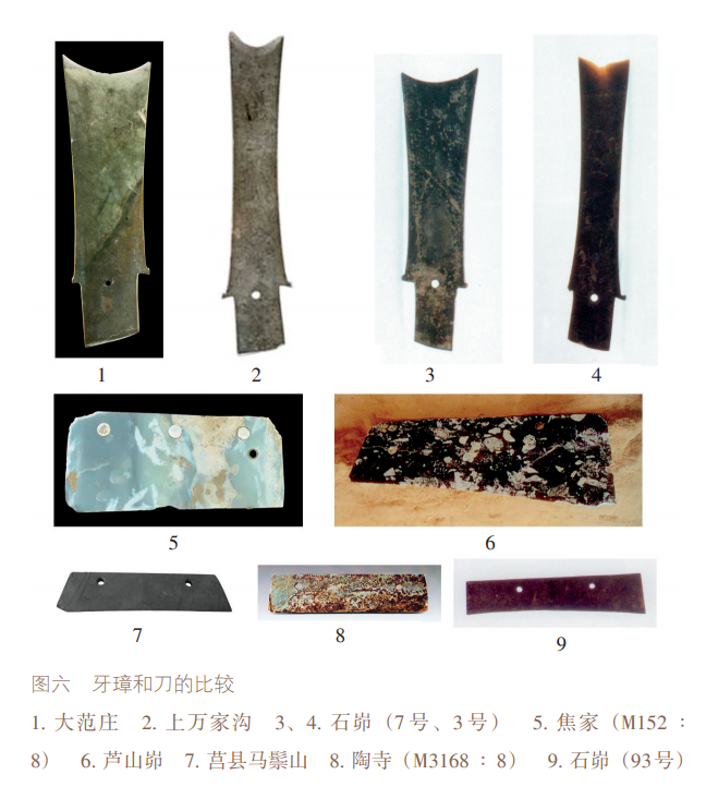 玉刀是陶寺、碧村和石峁三地共同拥有的另外一种器形。玉刀有两大类,双孔玉刀在陶寺、碧村和石峁均有发现。(图六:8、9) 这种长方形双孔玉刀与农业工具中的石刀在形制上别无二致,但是大小不同,实用的长方形石刀长度多在10厘米左右,而此类玉石刀的长度多在20厘米以上。并且黄河中游自仰韶文化以来,石刀多为单孔,双孔少见,而黄河下游的海岱地区,大汶口—龙山文化时期最流行的农具就是长方形双孔石刀。(图六:7)由于这种刀的原型是农具,就陶寺、碧村和石峁三地的社会经济形态而言,不应该首先产生于史前农业不发达的北方地区。