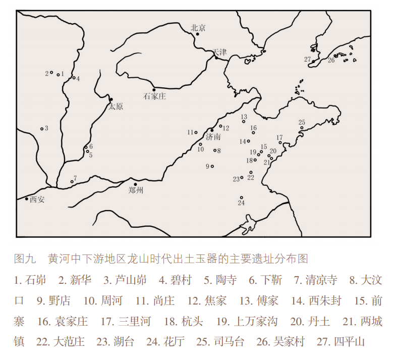 海岱地区大汶口—龙山文化系统与晋南地区史前文化之间,一直存在着密切的文化联系。陶寺遗址发掘报告的作者,曾从陶器和彩绘图案两个方面详细分析了陶寺遗址早期遗存中来自大汶口文化的文化因素。认为“陶寺文化早期陶器中蕴含的大汶口文化因素,包括相似器形10种以上;上述器形在陶寺早期演变出的新式样约七八种;上述器形基础上衍生出来的新器形10余种,三项合计不少于30种”[26]。在这样的历史文化背景下,东方海岱系玉器文化随着区域文化交流的大潮被一起带到了中原地区,并进一步向更远的区域扩散,不仅是完全可能的,而且也很容易理解。(图九)