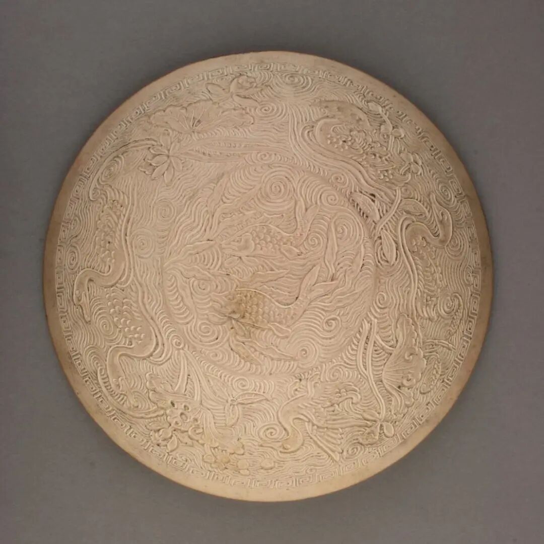 北宋晚期至金代,定窑白瓷的装饰纹样空前丰富,除了传统的莲瓣纹、卷草纹、缠枝牡丹等图案化纹饰外,还出现了大量反映现实生活内容的图案。
