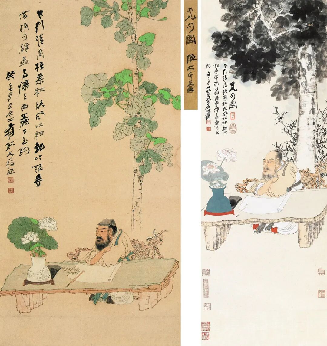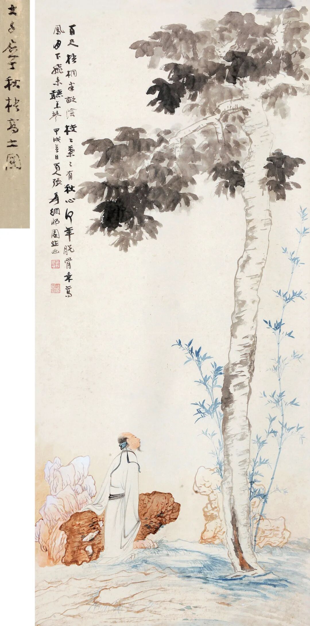 1934年的张大千还处于个人艺术生命的前期,尚以拟古仿古为主,笔下意象、结构、题材大要不出传统苑囿,特别是他标志性的宽袍大袖的高士形象。此帧作于苏州网师园、北平之行前夕,并绘梧桐、修竹、灵石、高士,同时集合可以引凤的梧桐、修竹两种,又配以可自许君子的灵石,且于题款诗中再三致意,所谓“何年脱骨乘鸾凤,月下飞来听素琴”云云,其对北平之行可大展拳脚扬名立万的无限向往和深切憧憬可见一斑。