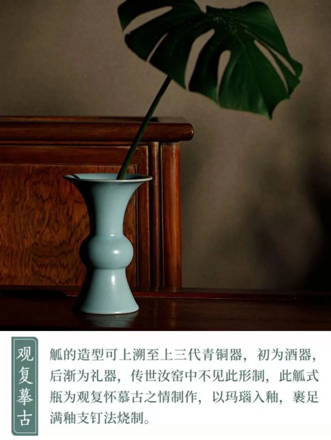 明清两代的仿古非常具有承前启后的作用,可谓既梳理了前代器型、纹饰、用材的文化源流,又启发了后世物质爆发期的古器再创造。如观复博物馆创作的汝窑花觚,即将宋代汝窑的天青色与文人的崇礼情结结合起来。用一物则知其源,这是“引古人之雅飨今人日常”很重要的一步。▼