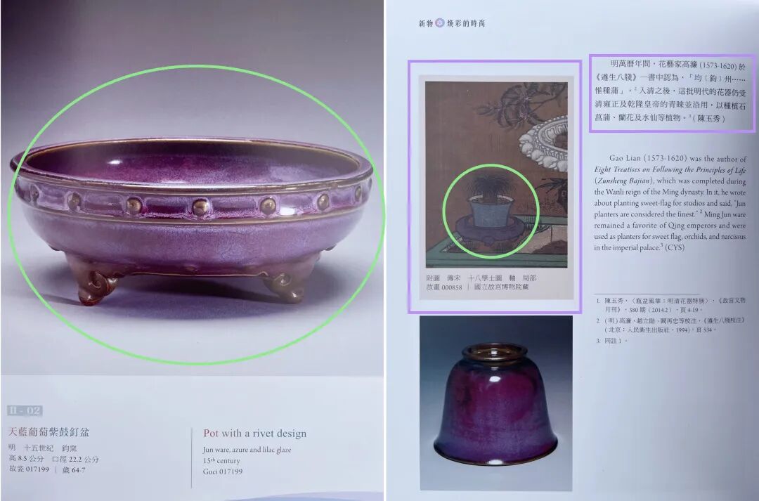 ▲《花事闲情》图册内页P40-41节选 除了对器物的精准描述之外,还对其源流出处有准确的描写,古画的部分更呈现出其物在空间中的陈列及致用情景,令读者对其尺寸、摆放位置、与空间及其他物件的协调配搭性均产生一定的感性认识。