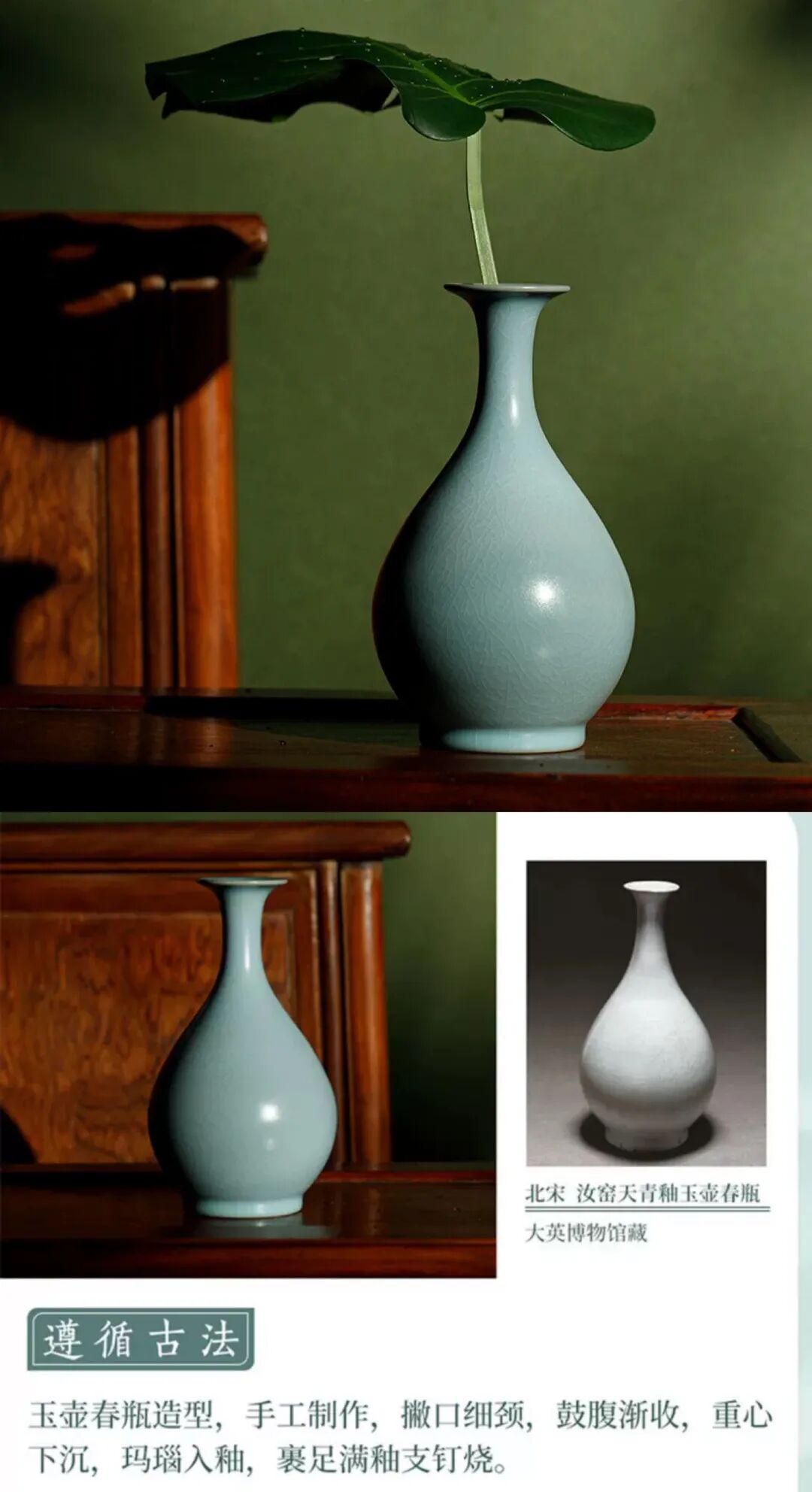 有源流可考,自然也就方便摹古造物,观复博物馆造汝窑玉壶春瓶,就是以大英博物馆馆藏的北宋汝窑天青釉玉壶春瓶为蓝本所造的五大名窑致敬巡礼之作▼