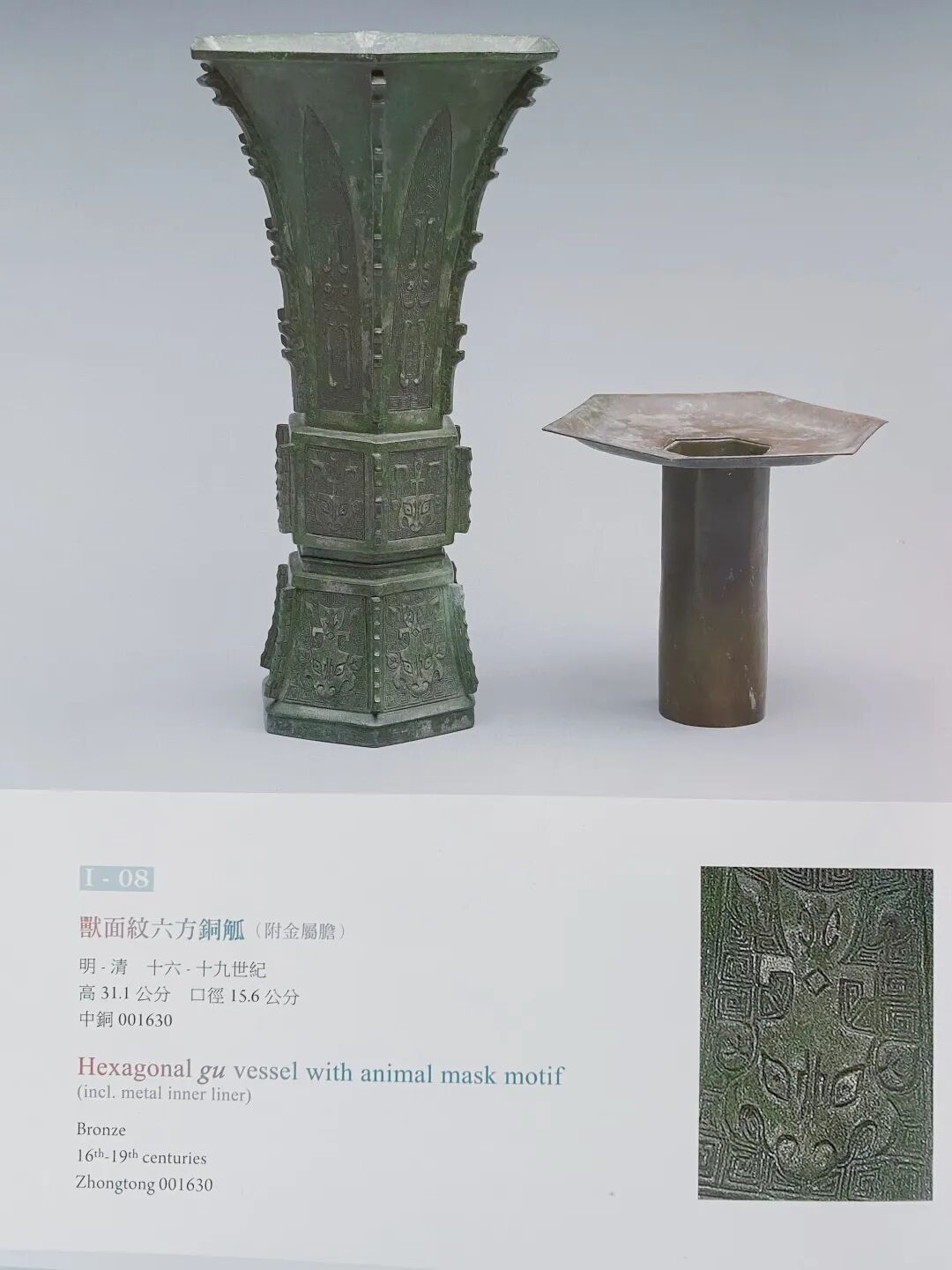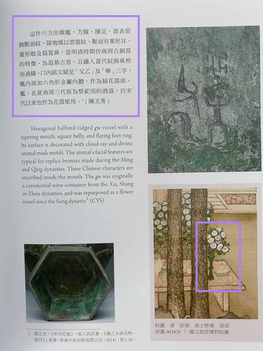 如此件兽面纹六方铜觚,即身具典型明清时代仿商周古铜器的特征。在介绍本件古器的同时,本书还不忘将其历史源流带出,讲明觚器的出处,可谓源流可考,实为了解物史之契机,功不仅止于器物本身▼
