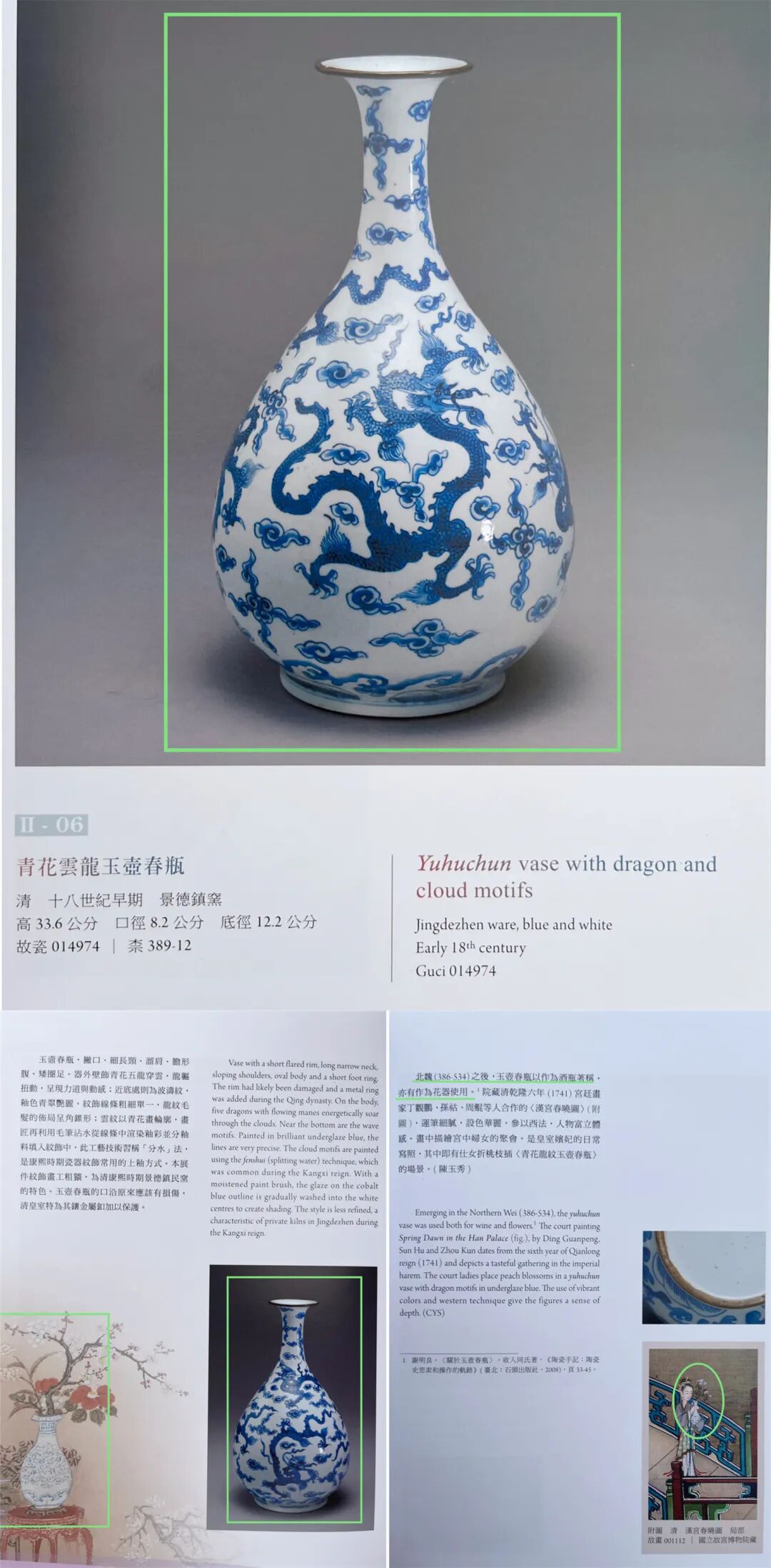 再如第二部分的“新物:焕彩的时尚”,则表达了在追求文雅至顶峰时,人们必然转而开始追求新颖的造型、纹饰的心理,从而顺应风尚的创新与自己内心对新兴事物的追求。在这个过程中,本书更详细梳理了一些“新物”的源流探究,如这件青花云龙玉壶春瓶及其所引发的玉壶春瓶发展史陈述▼