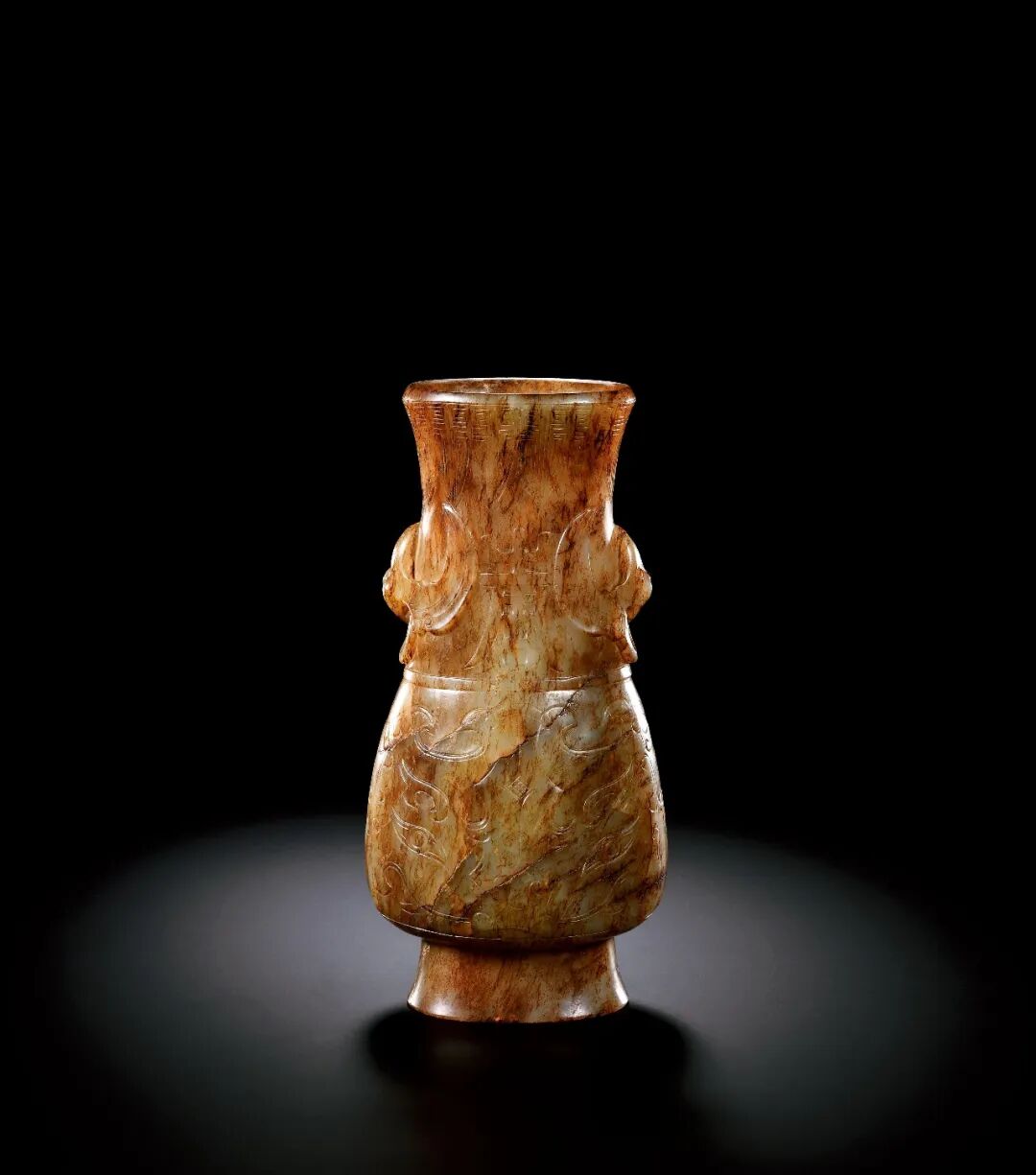 此件兽面纹尊,其玉材用提油技法,以灰白玉雕琢,红褐色沁斑遍集整器。玉瓶造型模仿青铜器样式,瓶身敞口,束颈,敛腹,扁体,外撇高圈足。口沿与下腹部各饰回纹一周;颈部浮雕对称蝠纹耳,雕琢生动有趣;居中饰“寿”字纹,寓意“福寿双全”;颈腹以双弦纹为间,下腹以双线饰仿古兽面纹,前后纹饰对称,华贵而不俗。