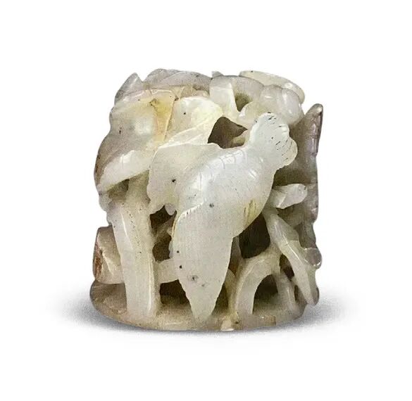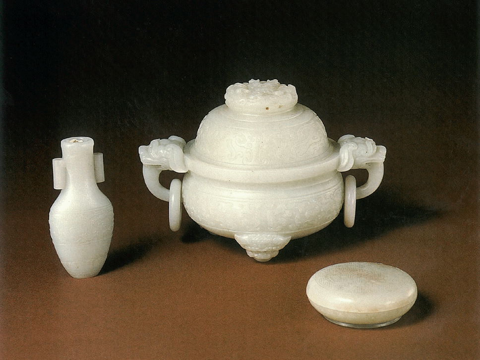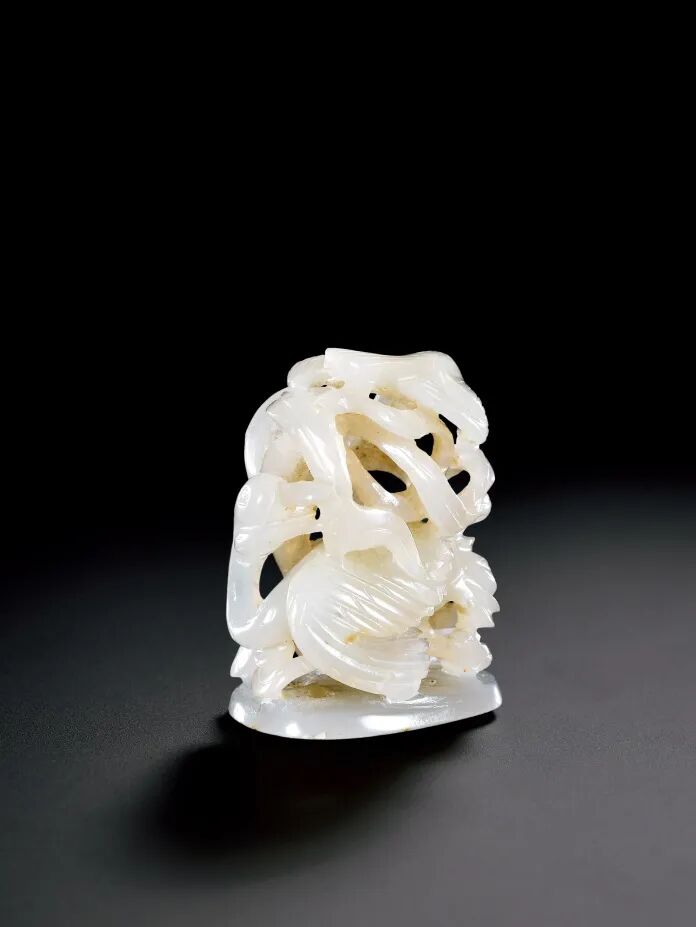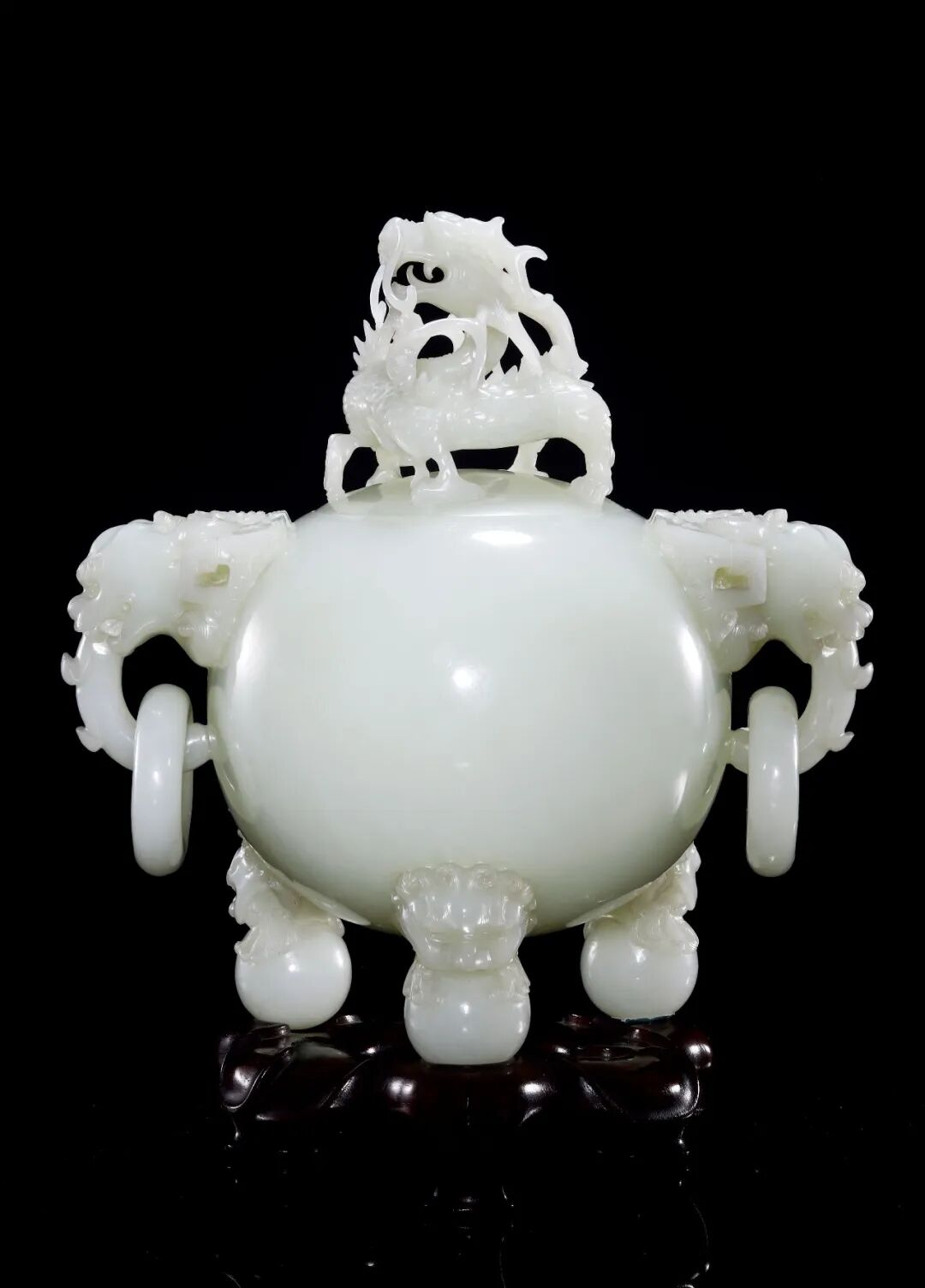 此炉具鲜明的清代宫廷治玉之风格,其所用玉材莹白无瑕,为典型乾隆二十四年平定准噶尔诸部后,从新疆贡入内廷的和田玉料。整器处处皆可见镂雕装饰,用料奢侈,琢磨细腻,球形炉腹周正光洁,亦是宫廷玉匠不计工时物料,精雕巧琢的结果。