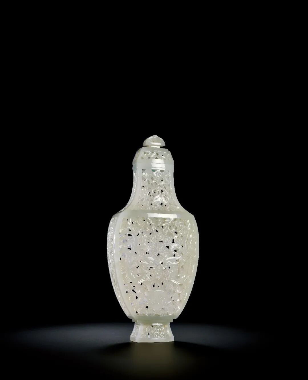 此件玉瓶选整块玉料雕琢,白玉材质,玉质温润细腻,晶莹通透。瓶身扁方,通体镂空透雕。玉瓶分为瓶盖、瓶身两部分,子母口相扣合。其上为扁方型瓶盖,状如覆斗。瓶身直颈,敛腹。瓶盖及瓶颈处镂雕云龙纹,瓶身两面镂刻气势非凡的双龙戏珠图案,与瓶颈部图案相互呼应。此类镂雕精巧的玉器,为清乾隆起,宫廷玉作受痕都斯坦玉器影响的作品,其纤巧精致的工艺风格颇受皇家喜爱,亦显出清宫廷玉作之风格。该拍品原配红木嵌银丝底座。
