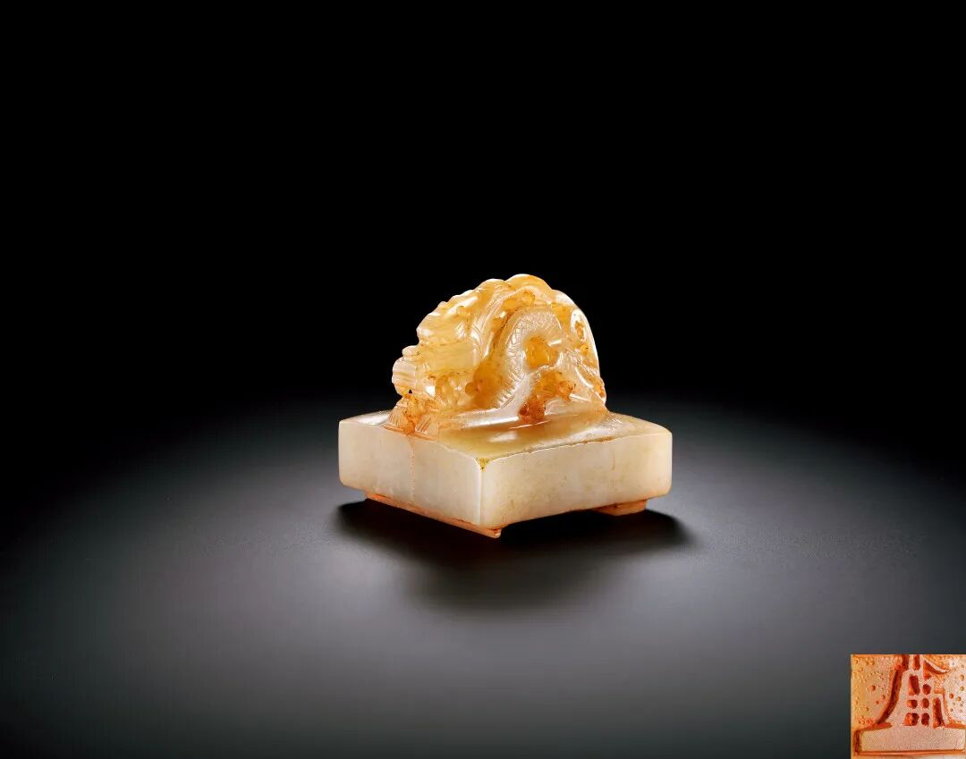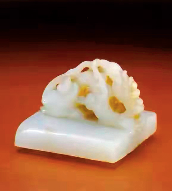 此件白玉龙钮印章,质地温和润泽,微带沁色,包浆厚重。印方形,玉龙蹲踞为钮,采用阴刻和镂空之法而成,身躯细长,龙角后伸,双爪前置,身躯拱起,后腿蹲立,呈蓄势待发状,似乎随时都可扑向前方之势。采用透雕技法,口齿、鬃毛等有多处穿孔,雕刻技艺高超;阴线简略修饰四肢、毛发纹路,生动形象。