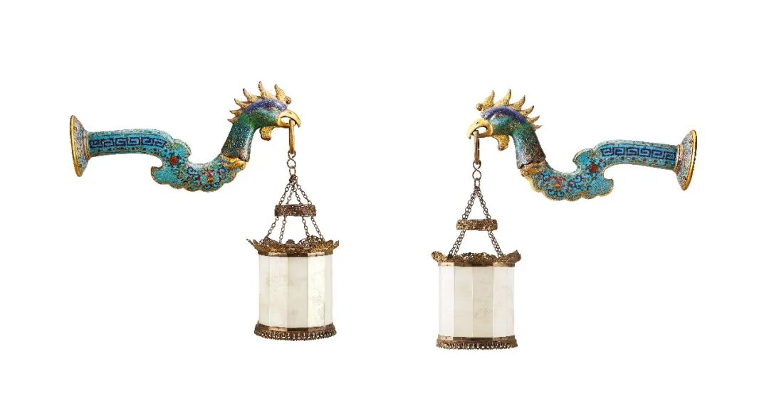 清乾隆 掐丝珐琅凤首挂架 配白玉刻龙纹宫灯一对