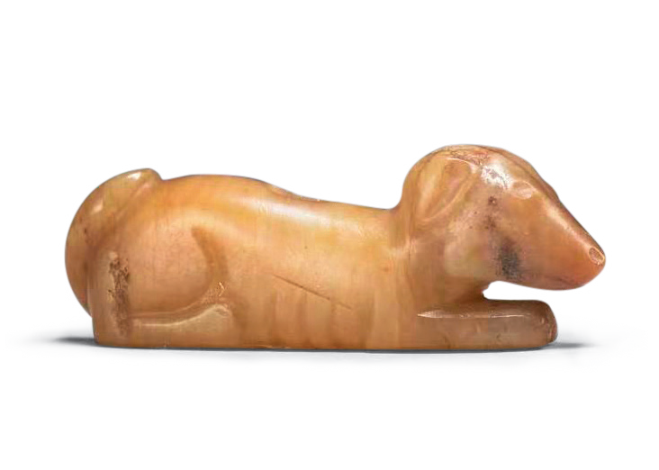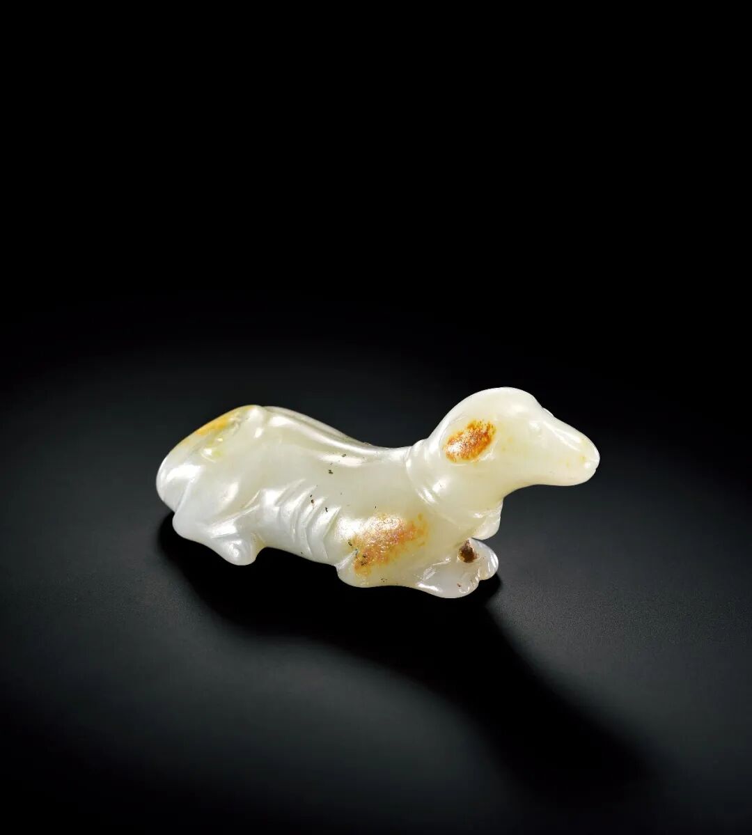 此件玉卧犬,质地温润,局部带有天然皮色。犬身体匀称修长,四肢细长,前腿趴伏于地,后肢卷曲收于腹下,作俯卧状。在肋骨处刻四条细线略微修饰,后肢收束,细尾卷曲上翘,神情安然而闲适。整体造型比例准确写实,细部刻划精准,为文人雅士赏玩的玉器佳品。