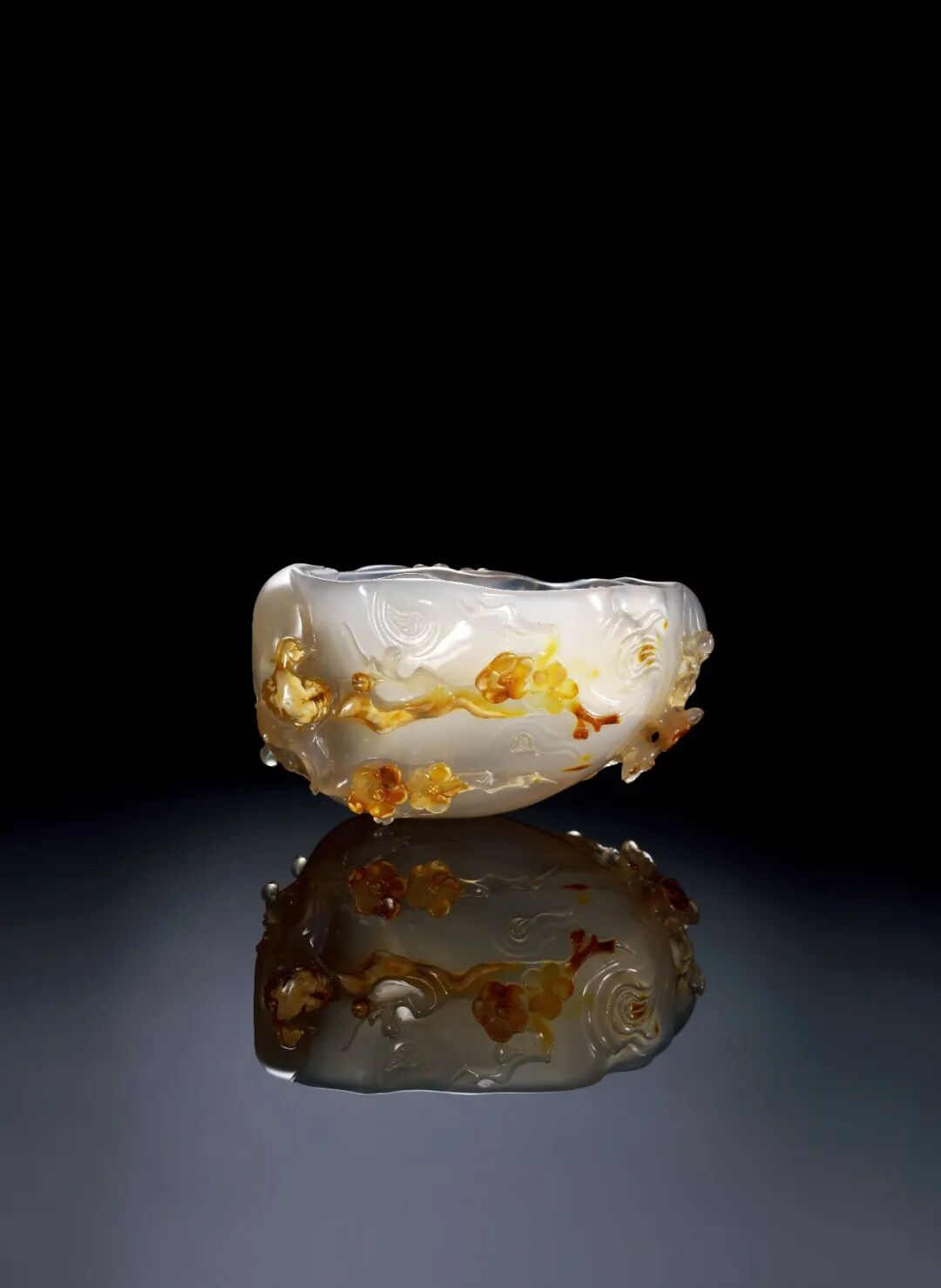 此水丞配有錾银随形盖,盖上镂空雕刻梅花虬干,配之喜鹊三两,正是与拍品主体相呼应,凑之喜鹊登梅之寓意,雕琢精细,与器辉映成趣。加工匠之巧工以神来之刀利用玛瑙天然的皮色,巧雕成器。拍品整体圆润秀雅,一气呵成,其玛瑙晶莹透亮之质,用以表现淡雅秀美的梅花,尤为合宜。加之一抹留皮巧作,更显精巧。