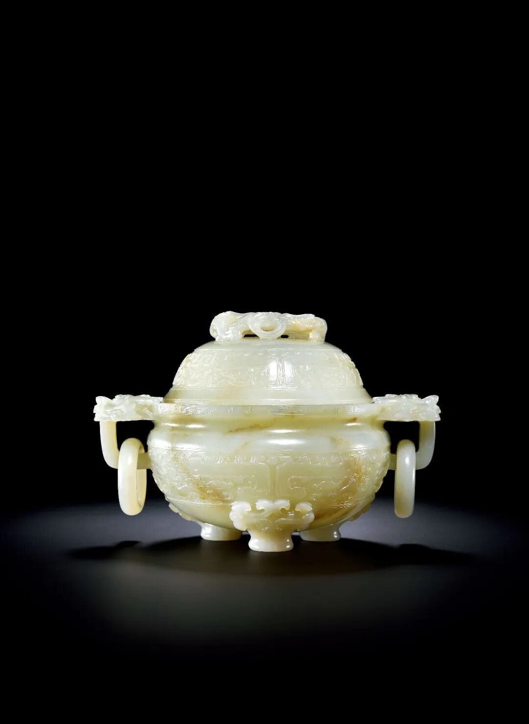 本品之蟠龙盖钮与浮雕兽面纹的三足,是其较为突出的特点。形制相似者,可参见北京故宫博物院藏和田青玉兽面纹炉,其与本品之炉钮几近一致,皆为盘龙造型,且三足亦以兽面为饰。彼件清宫旧藏,配有成套的玉瓶、玉盒,合为炉瓶三事一套,可知宫中此类玉炉,应是案前香具陈设所用。